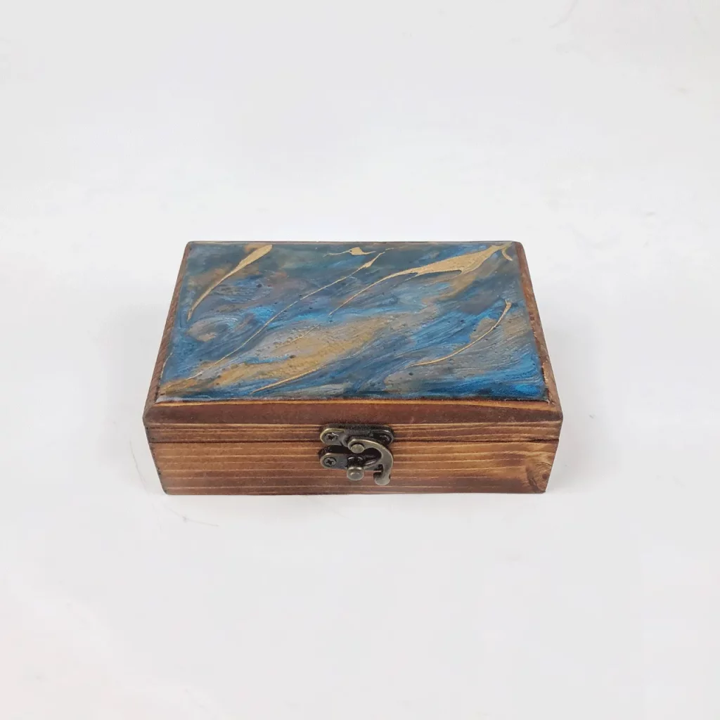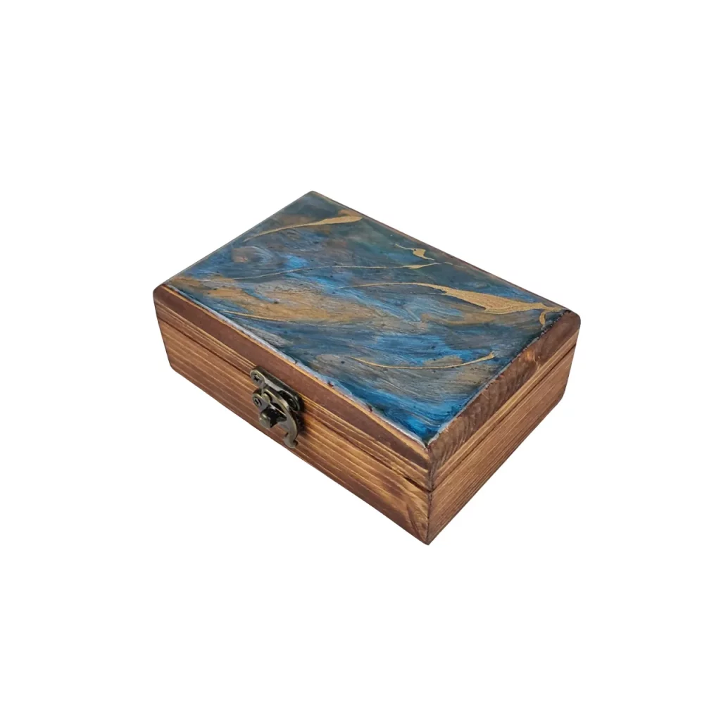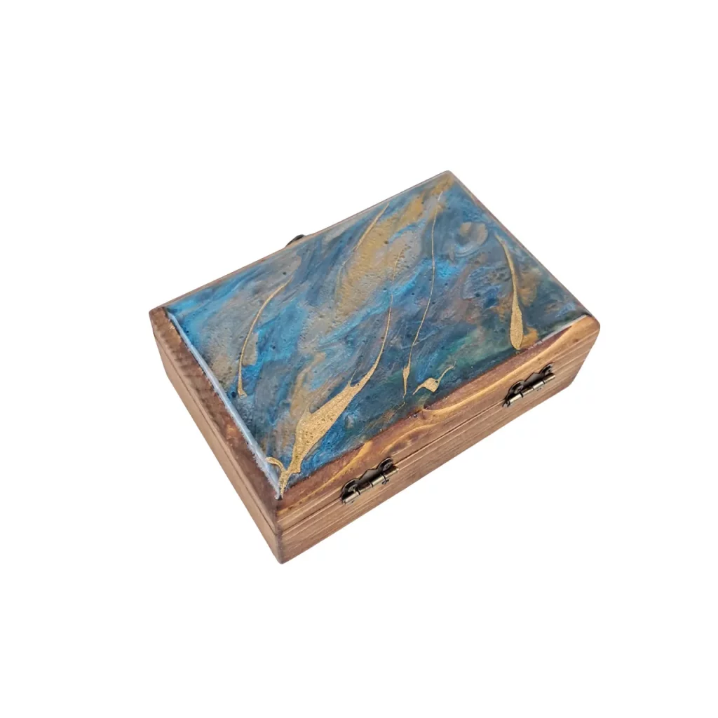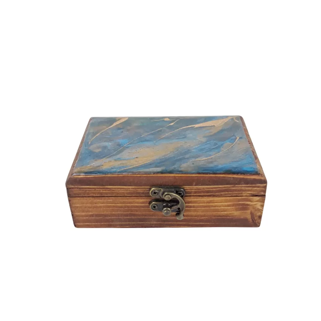 جعبهای از جنس چوب روسی با شکلی مستطیلی و ابعاد استاندارد که ترکیبی از طبیعت و هنر را به خود گرفته است. روی در آن با رزین شفاف پوشانده شده و طرحی زیبا از امواج دریا، شنهای ساحل و رنگهای آبی آرامشبخش خلق شده است. این جعبه نه تنها محلی عالی برای نگهداری جواهرات و اشیای ارزشمندتان است، بلکه خود یک قطعه دکوراتیو منحصربهفرد است که حس جانبخشی به فضا میآورد. خطوط چوب طبیعی در کنار براق بودن رزین تضاد جذابی ایجاد کرده که نگاه هر بینندهای را به خود جلب میکند.