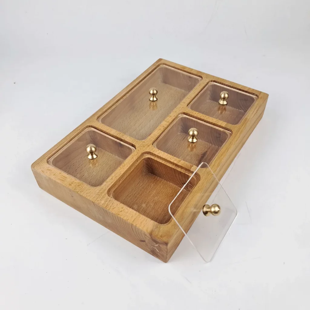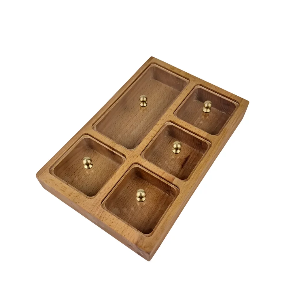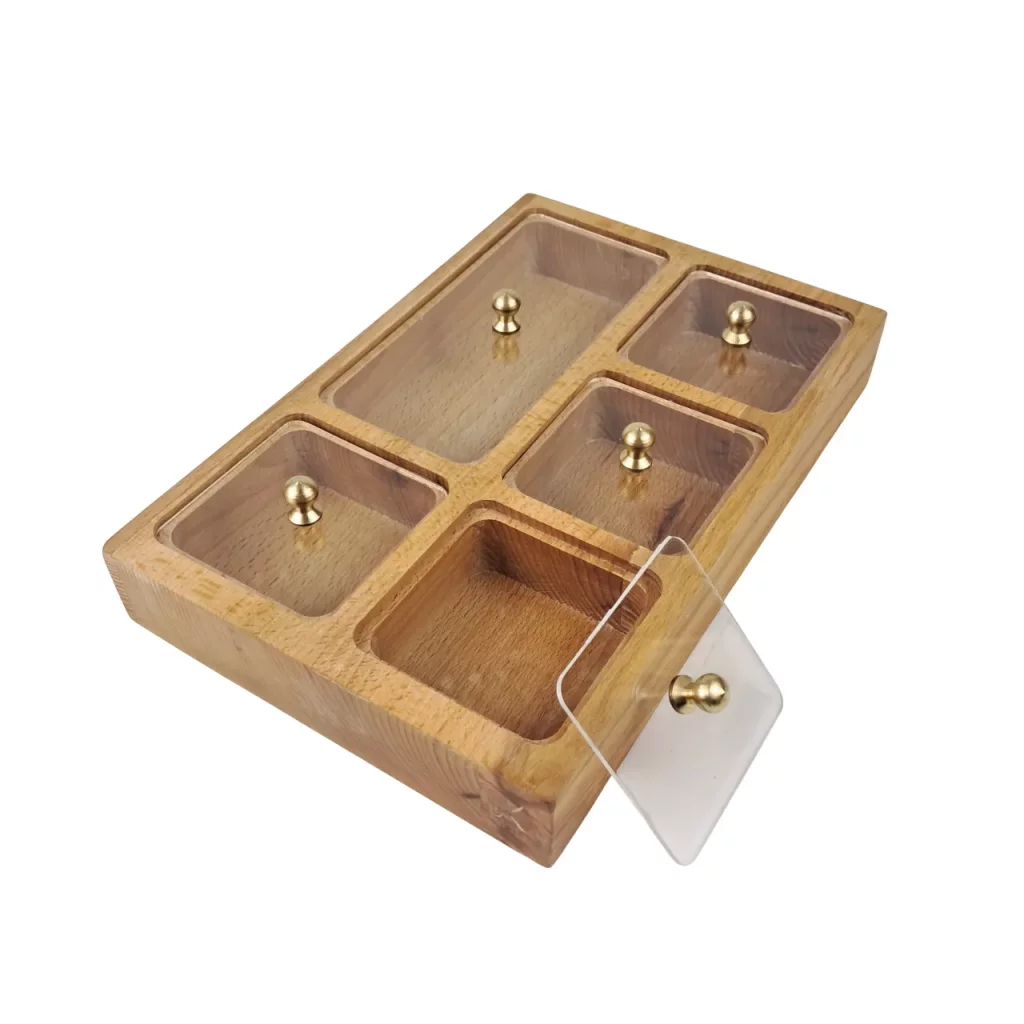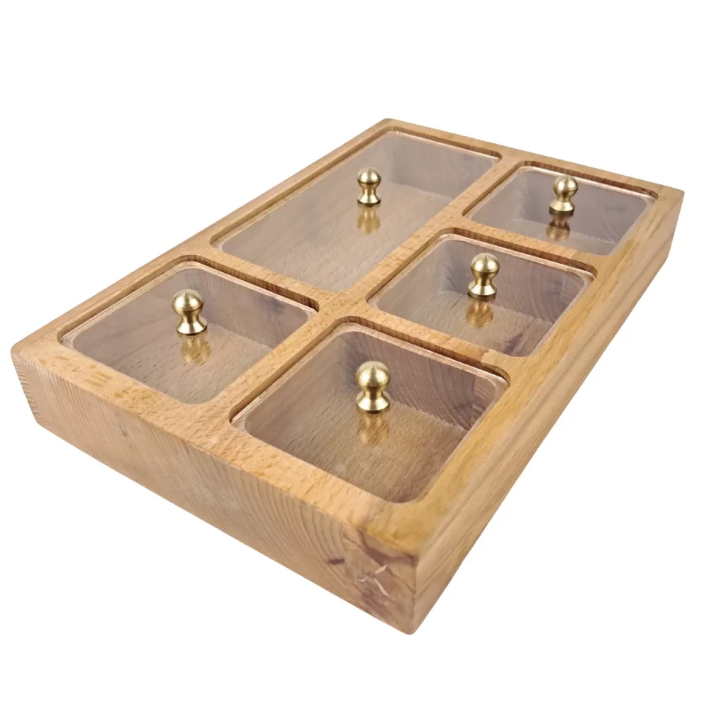 جعبه پذیرایی مستطیلی با بخشهای مجزا است که از چوب راش ساخته شده و دارای درب شیشهای یا شفاف است. این نوع جعبهها برای سرو تنقلات، آجیل، خشکبار یا شیرینی در میز پذیرایی استفاده میشوند و بخشبندی داخلی به تفکیک انواع خوراکی کمک میکند. دسته هر درب از جنس برنج است. این جعبه پذیرایی ۵ خانه دارد .راحی چوبی و طبیعی آن به زیبایی دکور میز میافزاید و حس گرما و صمیمیت به محیط میدهد.