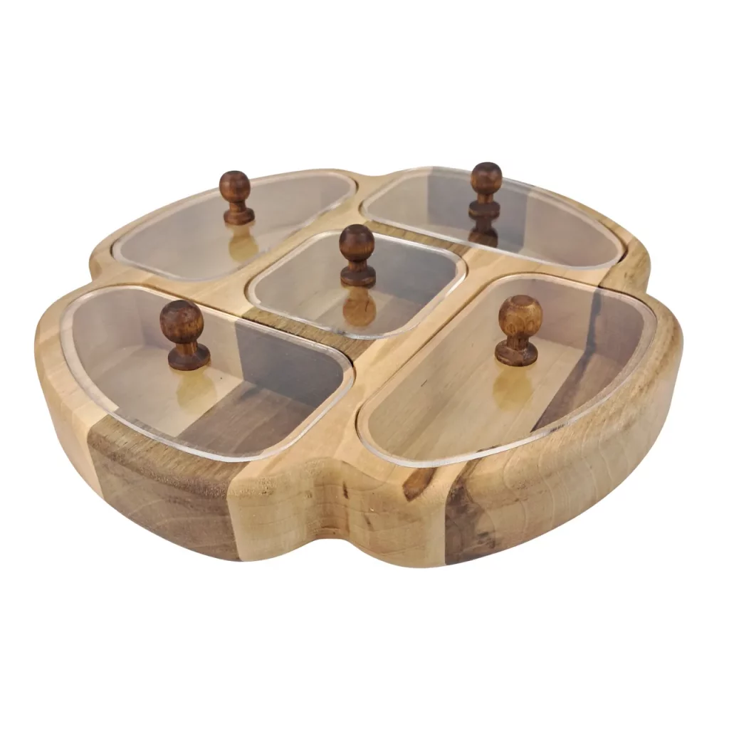 این جعبه پذیرایی ساخته شده از چوب گردوی باکیفیت، ترکیبی از زیبایی و کارایی را ارائه میدهد. این اردوخوری با پنج بخش مجزا، امکان چیدمان انواع تنقلات، خشکبار و خوراکیها را بهصورت مرتب فراهم میکند و دربهای آن، محافظت از محتویات را تضمین میکند. شکل گل محصول ، جلوهای هنری و دلنشین به محصول بخشیده و آن را برای استفاده در مهمانیها، مجالس و حتی هدیه دادن به گزینهای شیک و کاربردی تبدیل کرده است.