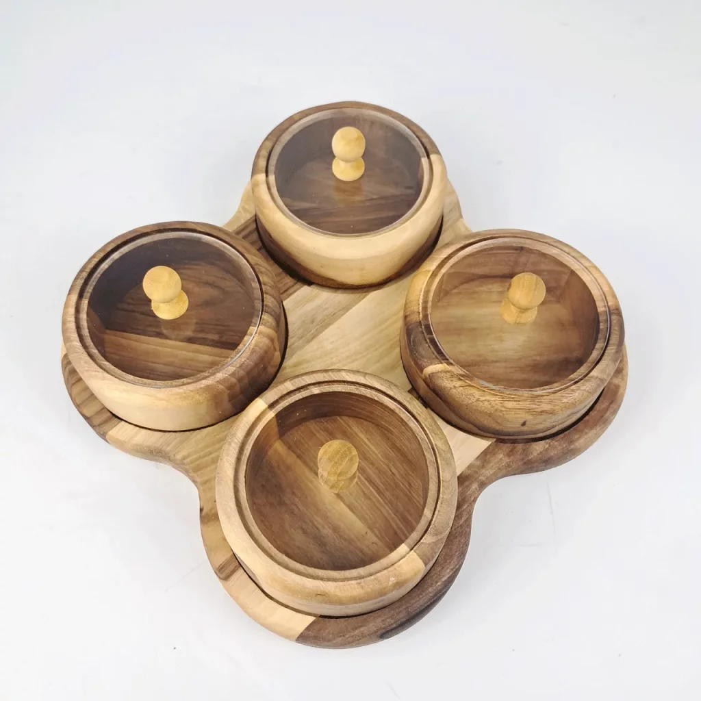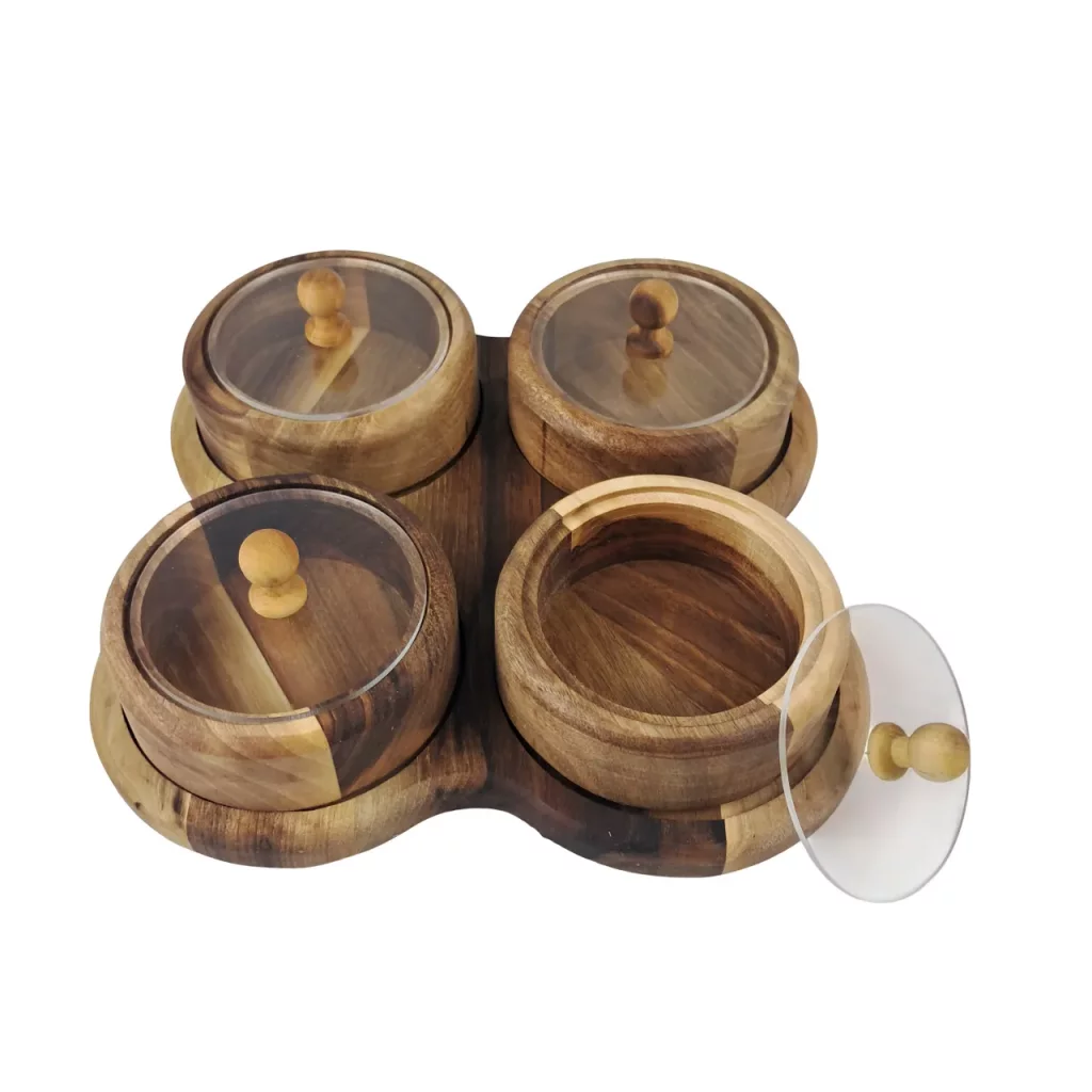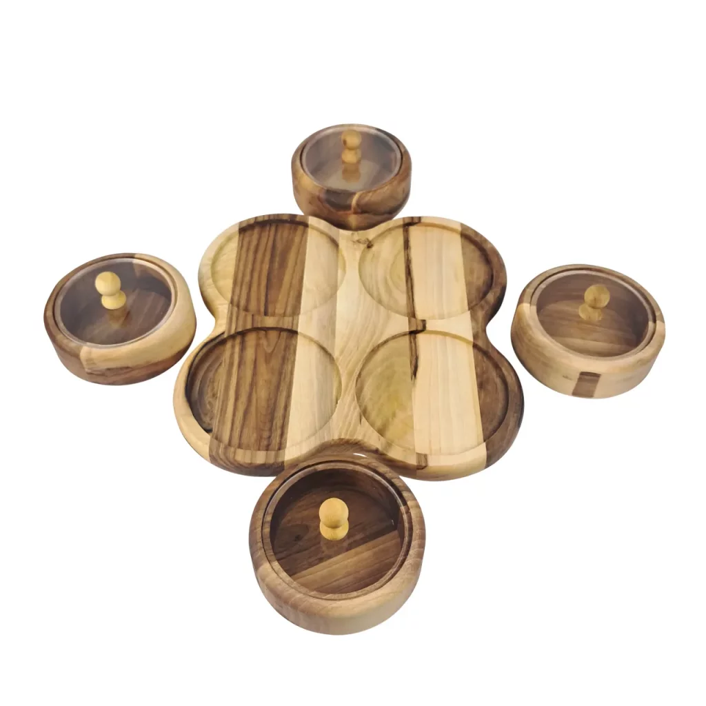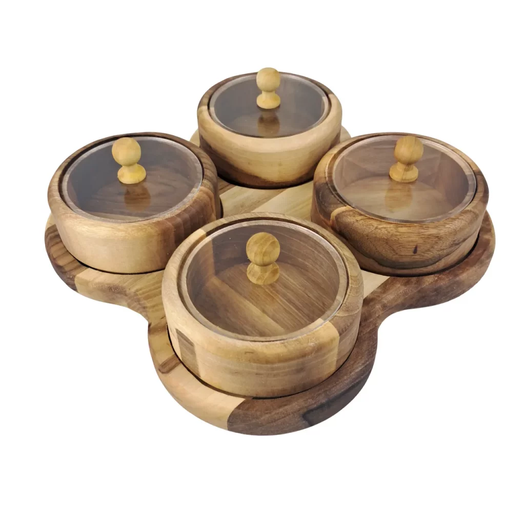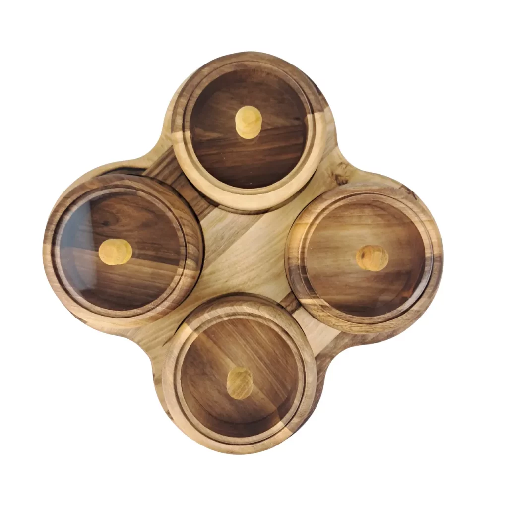 جعبه پذیرایی یک انتخاب زیبا و کاربردی برای پذیرایی شیک و منظم است. این جعبه از چوب مرغوب گردو ساخته شده و چهار محفظه دایرهای با قطر ۱۰ سانتیمتر دارد که برای نگهداری انواع خشکبار، شکلات یا دمنوش بسیار مناسب است. طراحی آن با استند چوبی باعث میشود هم ظاهر چشمنوازی داشته باشد و هم استفاده از آن آسانتر شود. رنگ طبیعی چوب گردو به این جعبه جلوهای لوکس و گرم میدهد و آن را به گزینهای ایدهآل برای میز پذیرایی یا هدیهای خاص تبدیل میکند.