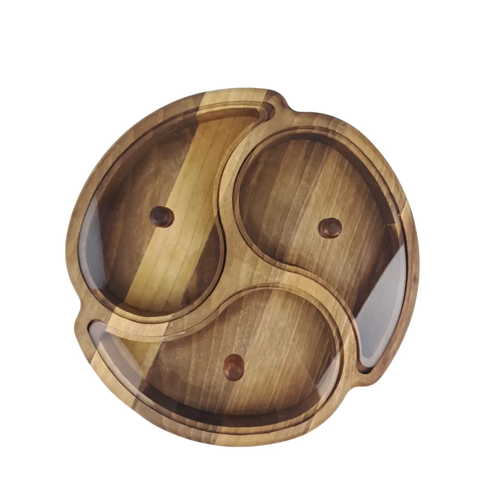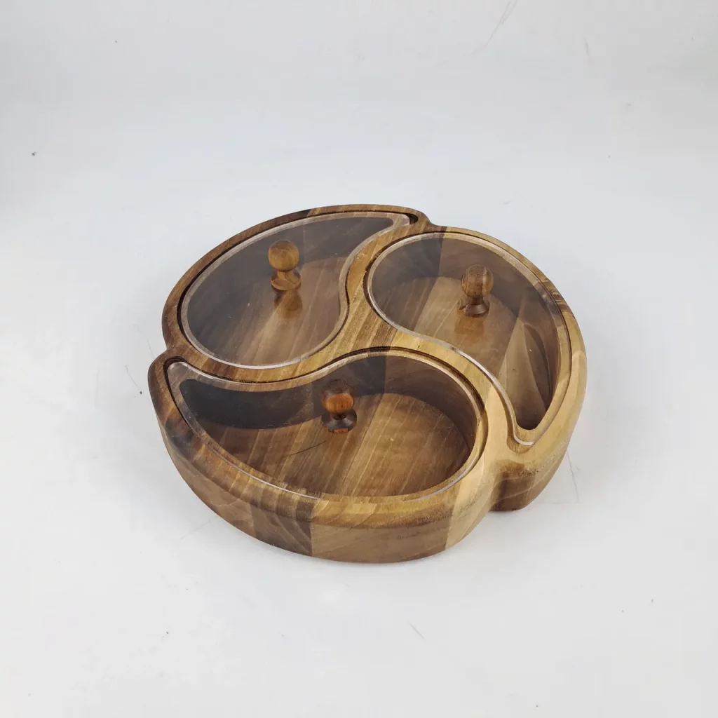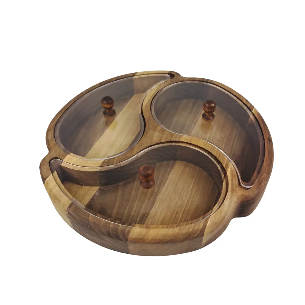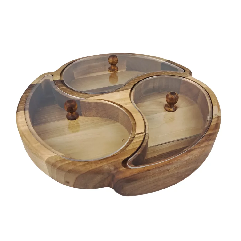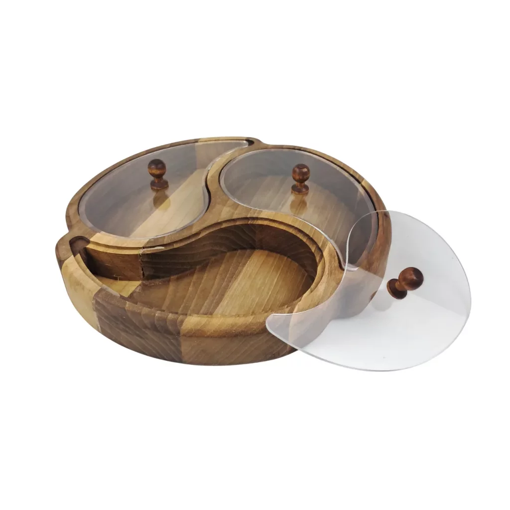 جعبه پذیرایی ترمه متوسط از چوب گردو، با طراحی سهخانهای خود جلوهای زیبا و کاربردی به میز پذیرایی شما میبخشد. این محصول با چوب طبیعی گردو ساخته شده و بافت گرم و اصیل آن حس لوکس و دلنشینی ایجاد میکند. هر خانه دارای درب شفاف و دستگیره چوبی ظریف است که علاوه بر زیبایی، از محتویات درون جعبه محافظت میکند. طراحی منحنی و هماهنگ بخشهای داخلی، استفاده از آن را برای سرو آجیل، خشکبار یا دمنوشها بسیار مناسب کرده است.