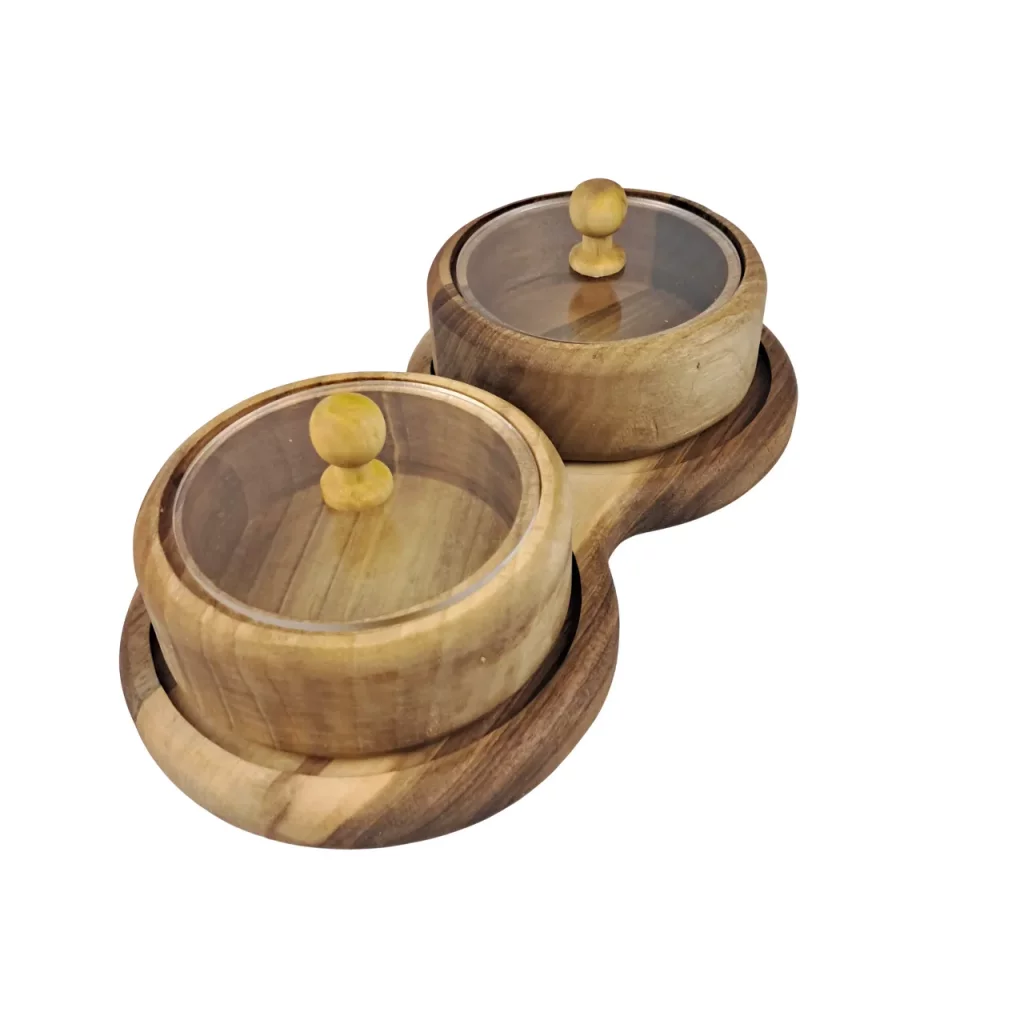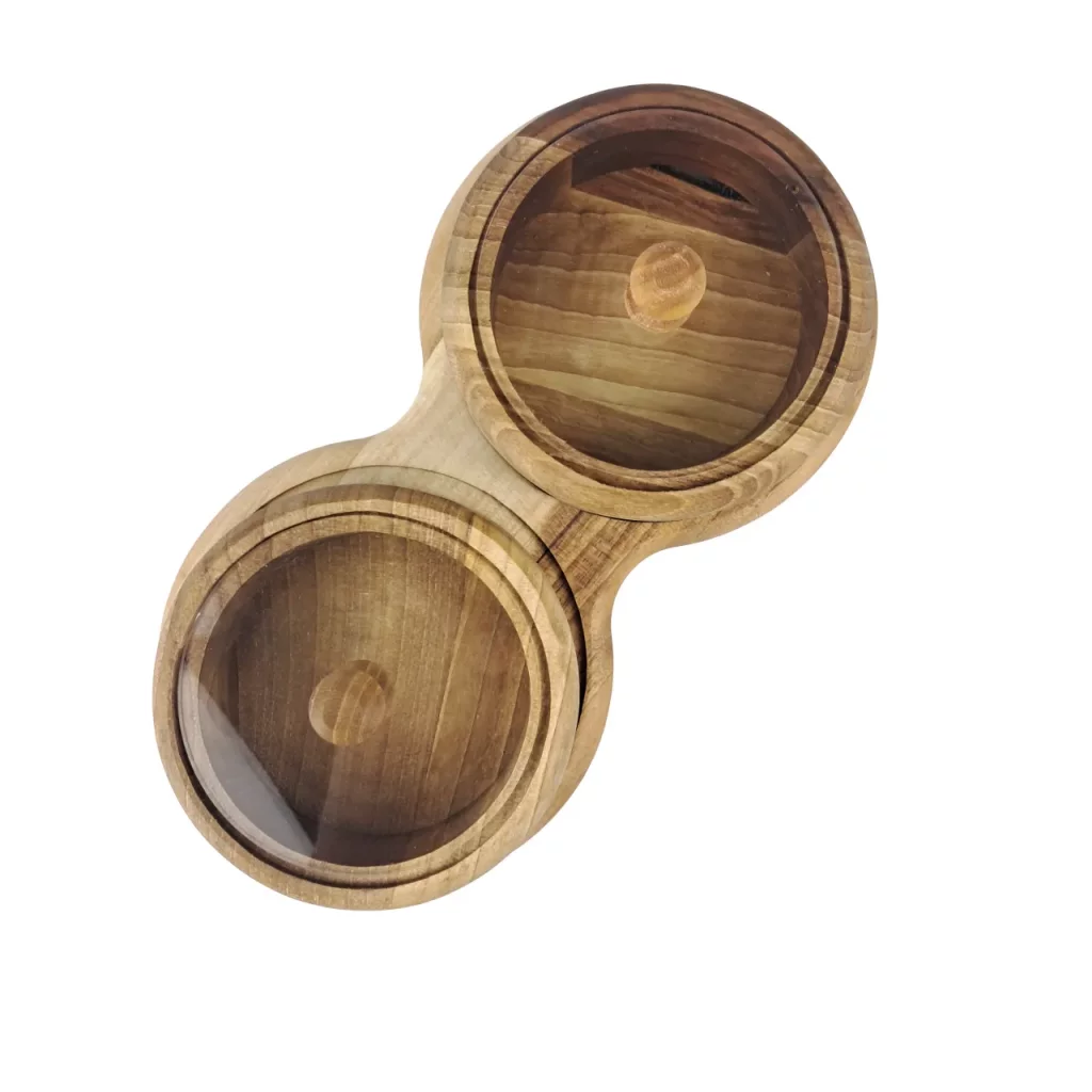 جعبه پذیرایی گرد دوخانه با استند، محصولی زیبا و مینیمال از چوب گردو است که با طراحی دایرهای خود جلوهای چشمنواز به میز پذیرایی میدهد. این جعبه دارای دو خانه مجزا با قطر ۱۰ سانتیمتر است که برای نگهداری آجیل، شکلات یا دمنوش بسیار مناسباند. استند چوبی گرد، تعادل و نظم خاصی به محصول میبخشد و حمل و جابهجایی آن را آسانتر میکند. رنگ طبیعی و بافت گرم چوب گردو، حس اصالت و ظرافت را در کنار کاربردپذیری به ارمغان آورده است.