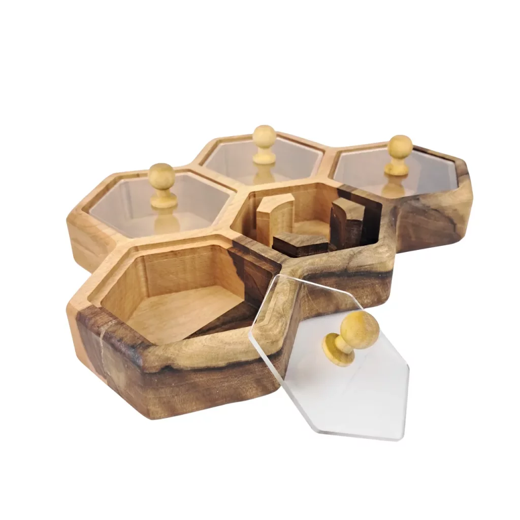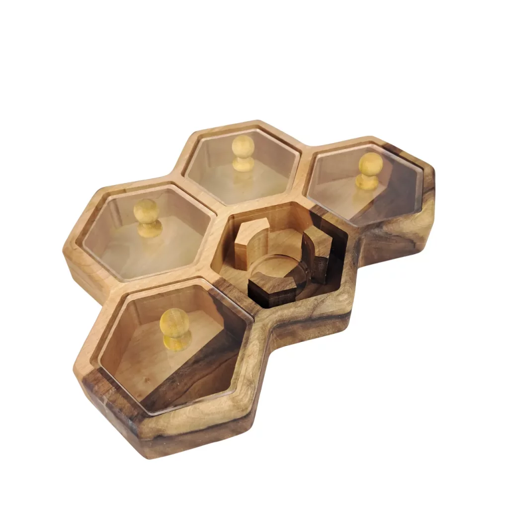این جعبه پذیرایی با طراحی زنبوری، ترکیبی از زیبایی و کارایی است و برای سرو تنقلات، شیرینی یا آجیل ایدهآل میباشد. شامل پنج خانه از جنس گردو ، چهار خانه دربدار از پلکسیگلس شفاف و یک خانه محل وارمر است که به سادگی محتویات داخل را نمایش میدهد. قطر هر خانه ۸ سانتیمتر است و با ابعاد استاندارد خود، جلوهای شیک و منظم روی میز پذیرایی ایجاد میکند. این جعبه علاوه بر زیبایی بصری، امکاناتی کاربردی برای نگهداری و سرو مواد خوراکی فراهم میآورد.