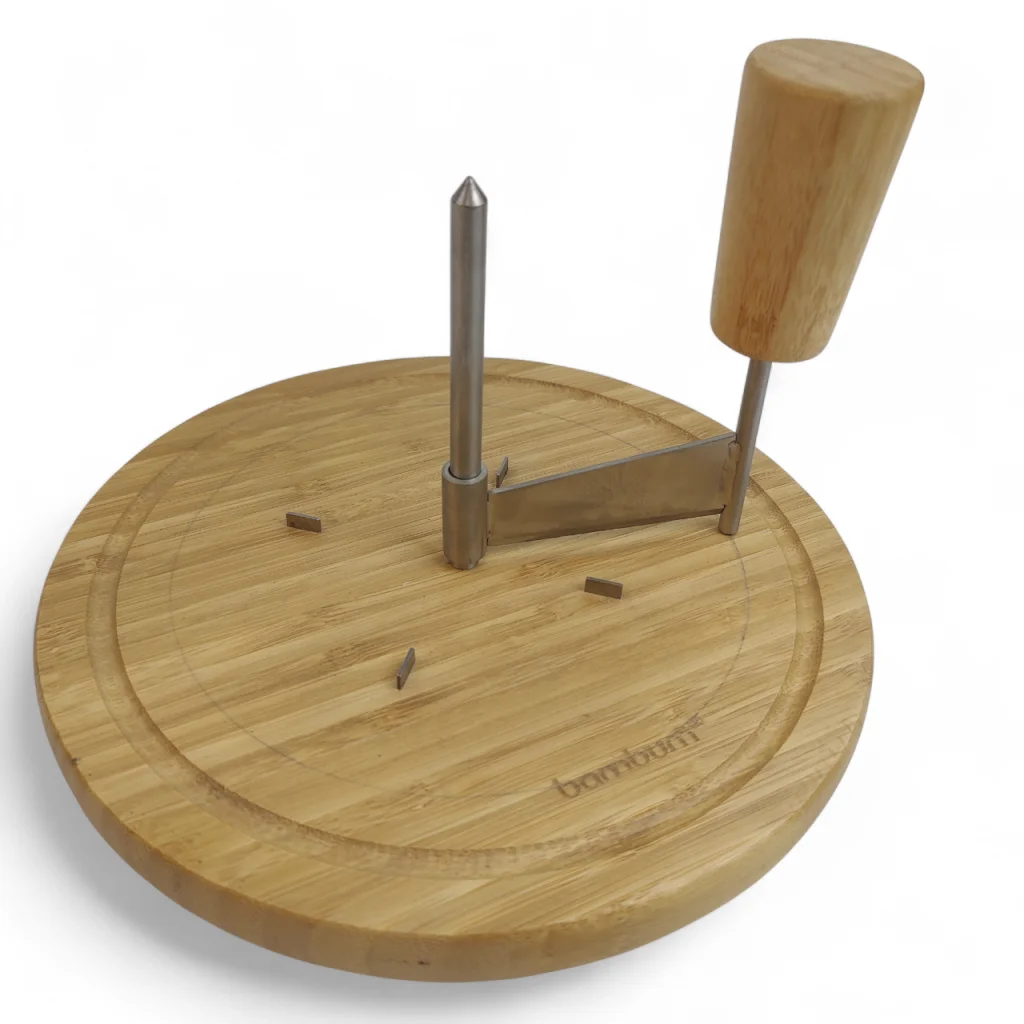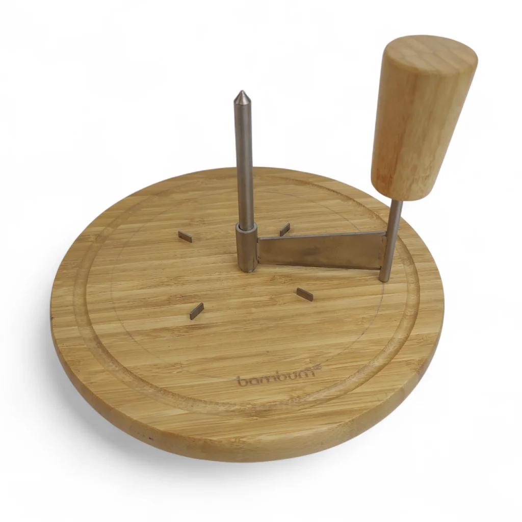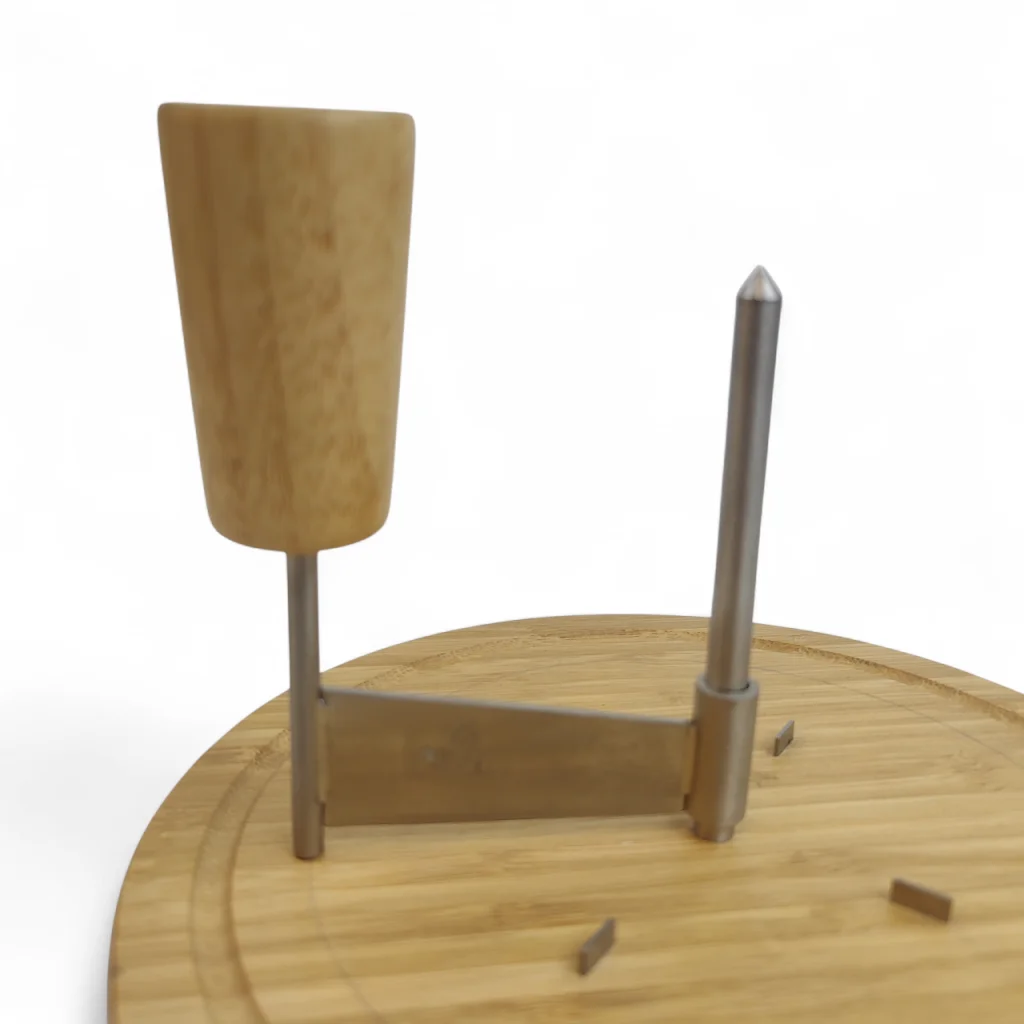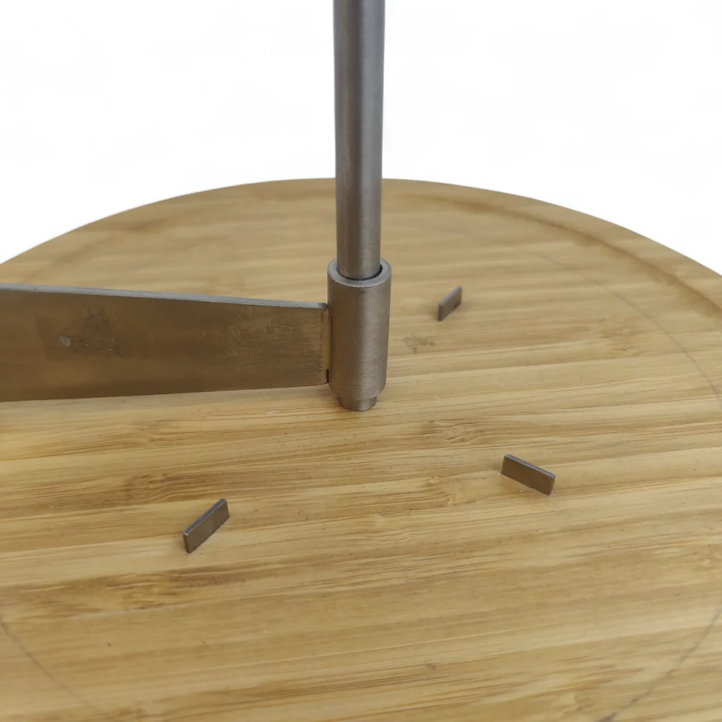 پنیر بر چوب و فلز ترکیبی از طراحی مدرن و عملکرد حرفهای است. این ابزار از پایهای دایرهای چوبی با تیغه و محور فلزی مقاوم ساخته شده که برای برش پنیرهای سخت و نیمهسخت بهشکل یکدست و زیبا طراحی شده است. دسته چوبی خوشدست و پایه ضدلغزش، کار با آن را آسان و دقیق میکند. انتخابی ایدهآل برای میز پذیرایی، کافهها و پکهای هدیه لوکس آشپزخانه است.
