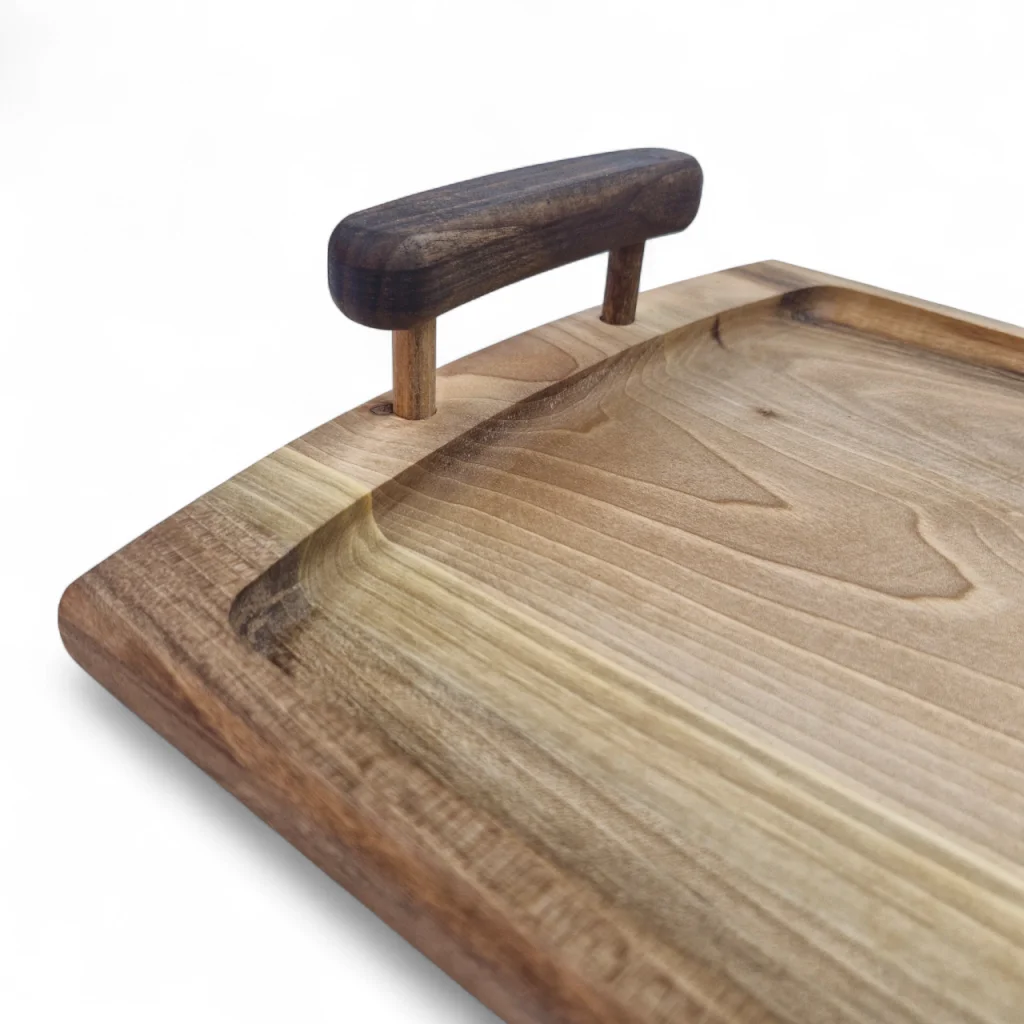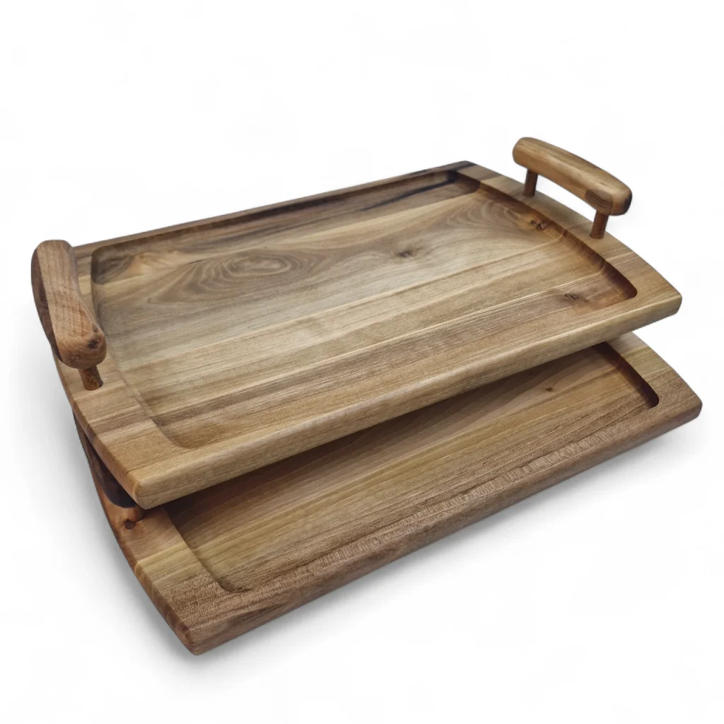 سینی پذیرایی مستطیل از چوب گردو با دسته چوبی، ترکیبی از عملکرد و زیبایی طبیعت است. رنگ گرم گردو و طراحی ساده مستطیلی آن، جداسازی مرتب غذاها را امکانپذیر میکند، در حالی که دستهها حرکت سینی را آسان کرده و جلوهی لوکسی به سرو شما میدهد.