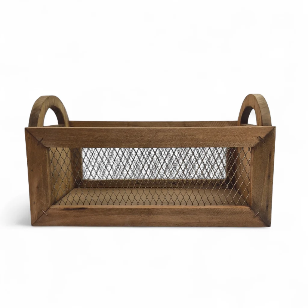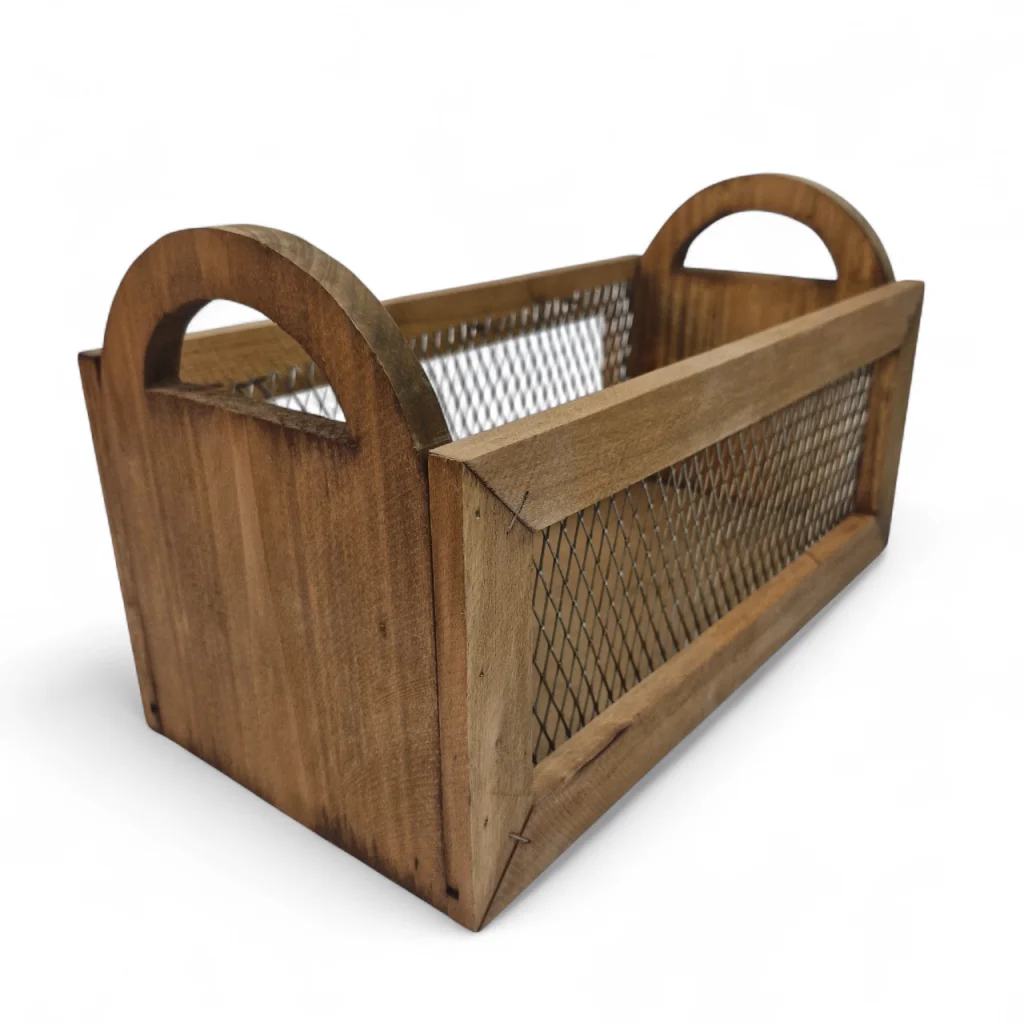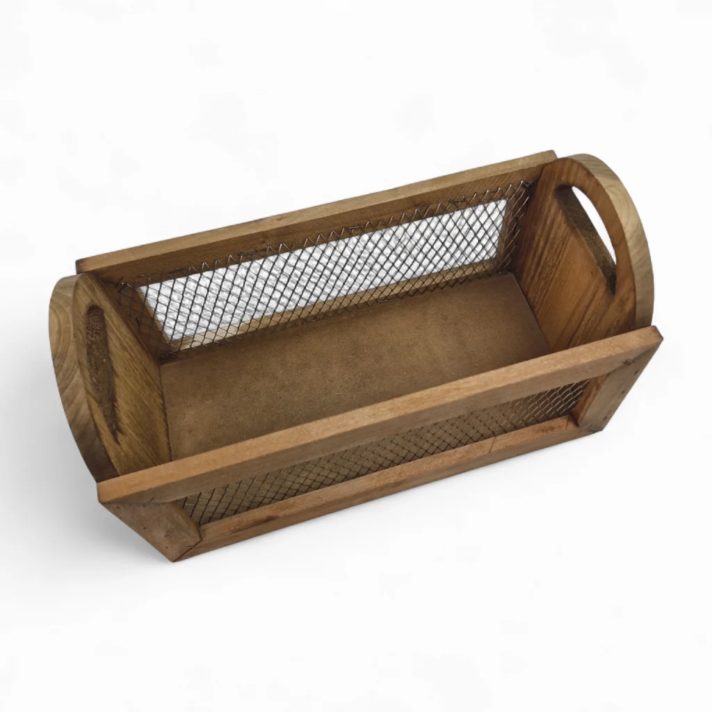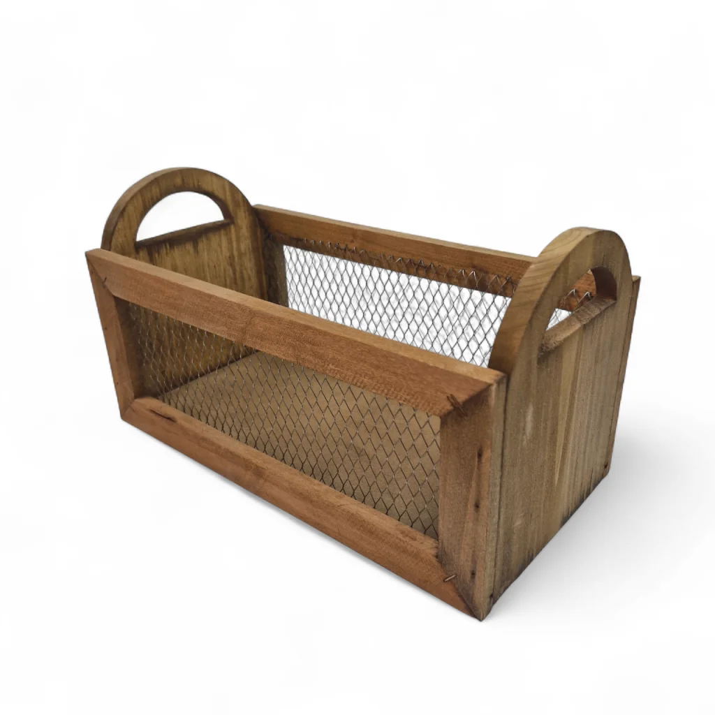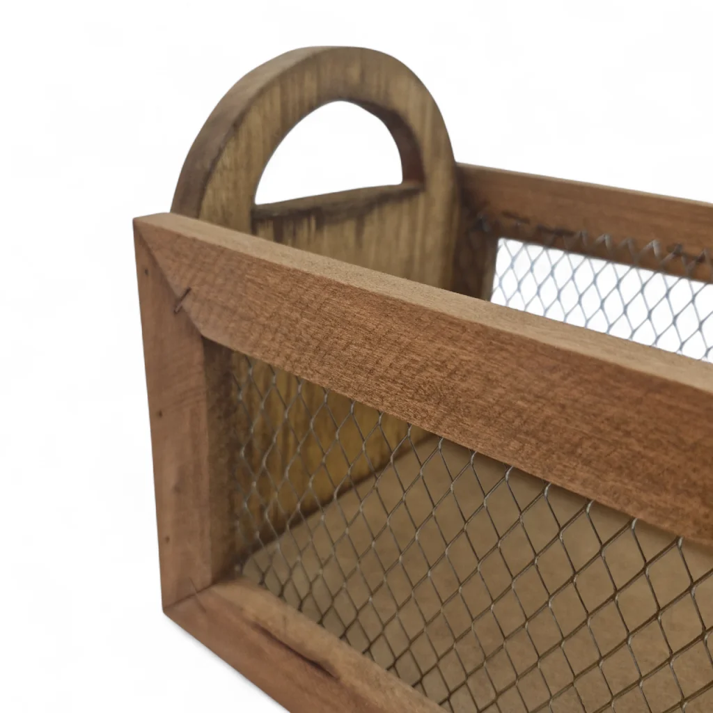 یک سبد با کاربری نظم دهی و دکوراتیو با طراحی ترکیبی از «چوب نراد روسی (چوب روس)» و سیم فلزی در دو طرف آن. بدنه اصلی سبد از چوب نراد (روسی) ساخته شده که سبک، روشن و گرم است؛ این چوب بهدلیل رنگ ملایم و ویژگیهای طبیعیاش در دکوراسیون روستیک یا مدرن بهخوبی جای میگیرد. کنارههای سبد با فنس (سیم فلزی) ساخته شدهاند که علاوه بر مقاومت اضافی، ظاهر صنعتی / فارمهاوس به سبد میدهد و امکان دیدن محتویات درون سبد را فراهم میکند. ترکیب چوب و فلز باعث شده هم زیبایی طبیعی چوب حفظ شود و هم استحکام و تهویهای که سیم فلزی فراهم میکند، به کارکرد سبد کمک کند. این سبد میتواند برای نگهداری میوه، حوله، کتاب، گیاهان کوچک یا حتی بهعنوان المان دکوری در فضا استفاده شود.