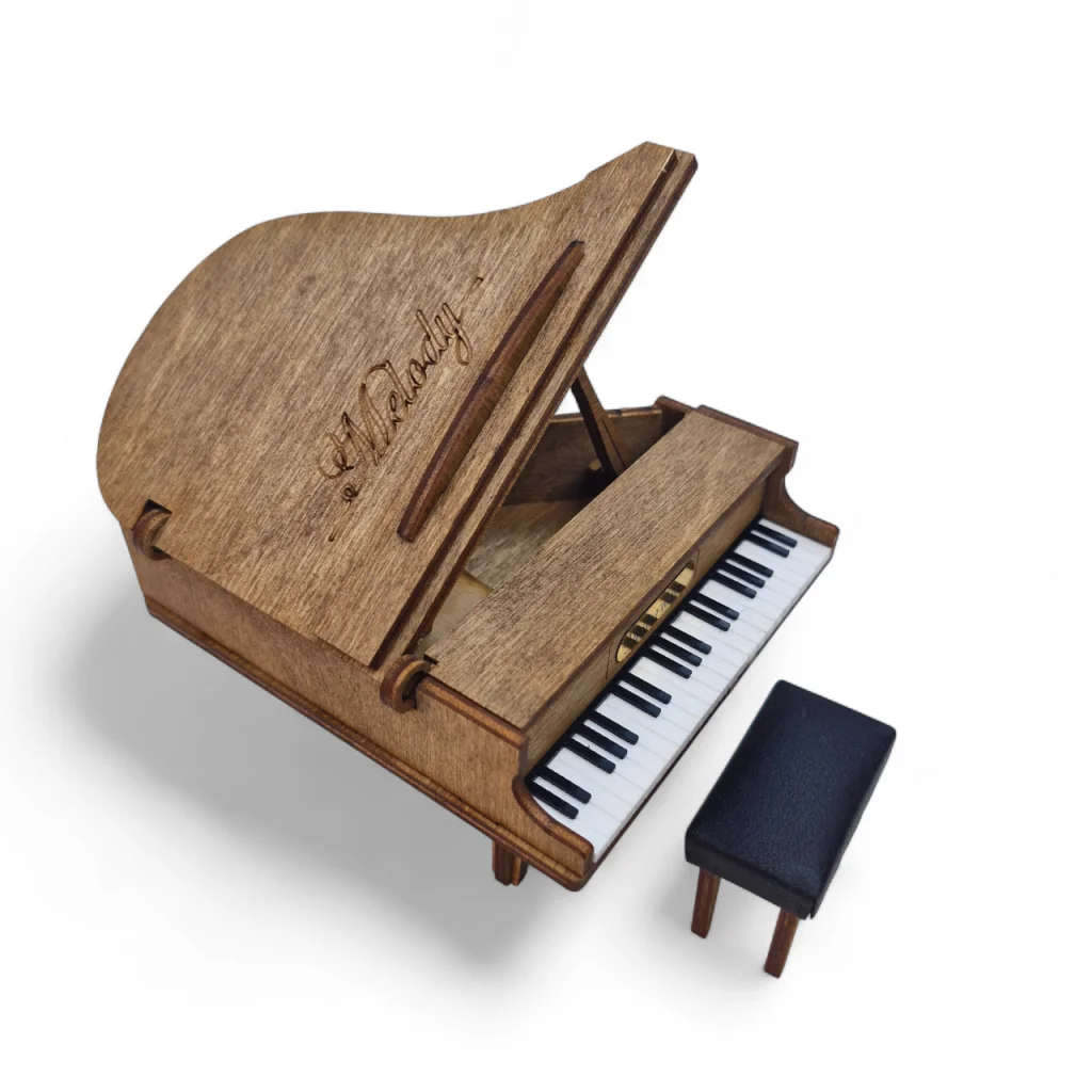 ماکت پیانو گرند چوبی موزیکال با الهام از فرم جذاب پیانوهای گرند کلاسیک، یک قطعه دکوراتیو هنری و چشمگیر است که بافت طبیعی چوب در کنار جزئیات ظریف و ساخت دقیق آن، جلوهای لوکس و متفاوت به میز کار، شلف یا دکور منزل میبخشد؛ قابلیت پخش موسیقی، این ماکت را از یک وسیله صرفاً تزئینی به یک اکسسوری خاص و روحبخش تبدیل میکند و حس آرامش و لطافت را به فضا اضافه مینماید، طراحی دقیق درب، پایهها و فرم بدنه باعث شده این محصول همچون یک پیانو واقعی کوچک جلوه کند و استحکام بالا و کیفیت ساخت آن، انتخابی عالی برای هدیهدادن به علاقهمندان موسیقی و دکورهای کلاسیک یا هنری باشد.