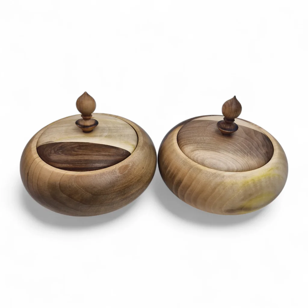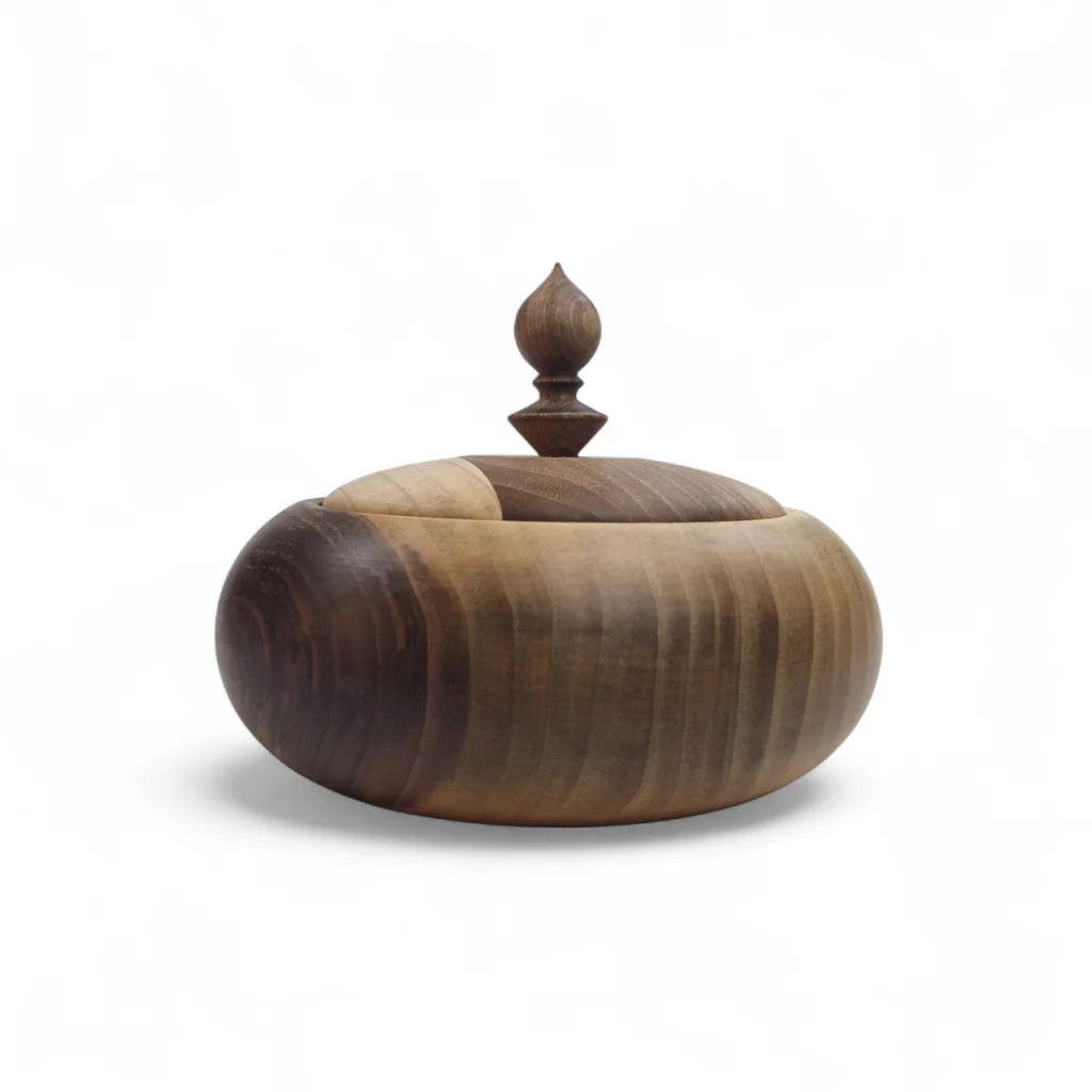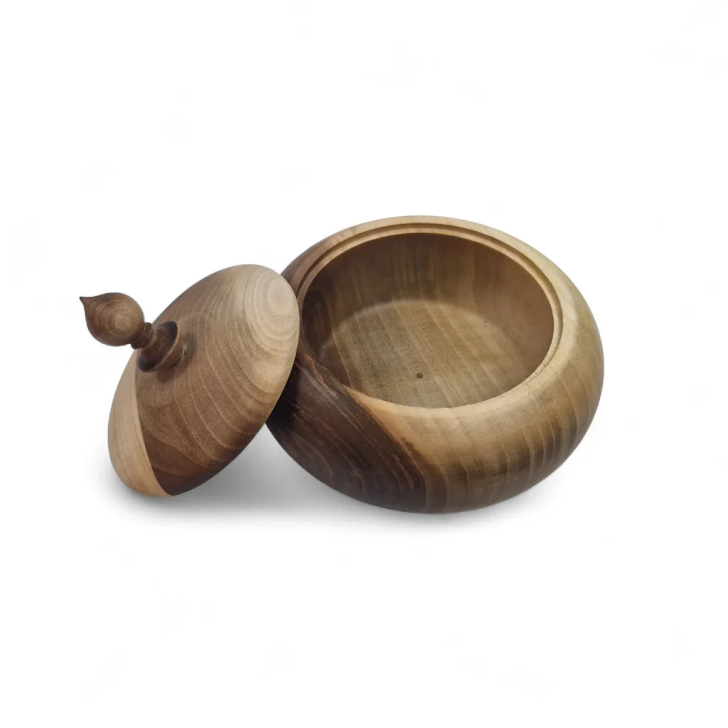 شکلاتخوری چوبی دردار از جنس گردو، طراحیای نرم و مدور دارد که حس گرمای طبیعی چوب و ظرافت را به فضای پذیرایی شما میآورد. درب چوبی بهصورت جداشدنی است تا بتواند شکلاتها یا تنقلات را بهخوبی محافظت کند، و در عین حال ظاهر دکوراتیو چشمنوازی دارد. چنین ظرفی نهتنها برای سرو شکلات کاربردی است، بلکه به عنوان یک قطعه دکوری چوبی با ارزش در میز یا بوفه شما میدرخشد.