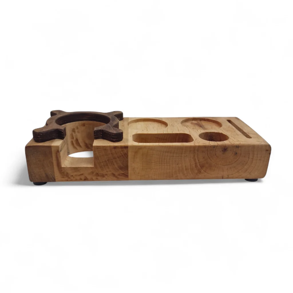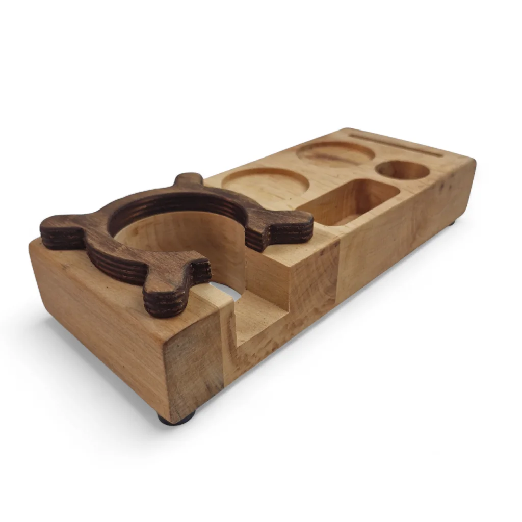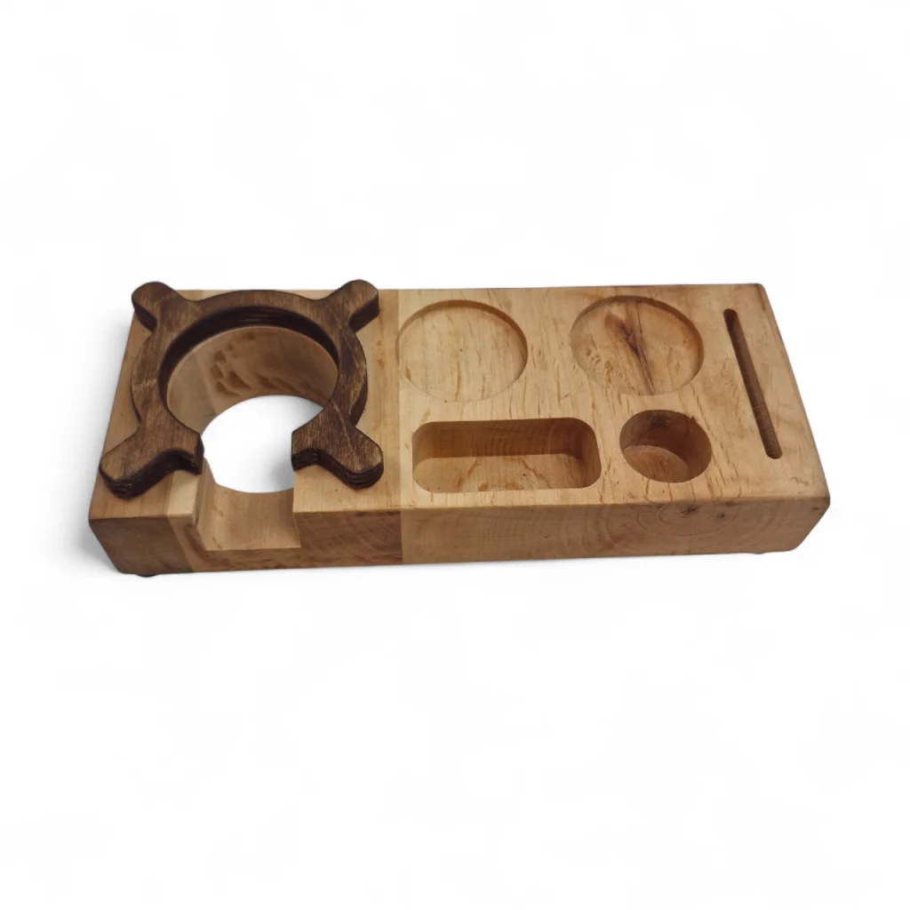 استند اسپرسو مینی با طراحی جمعوجور و جذاب از چوب طبیعی ساخته شده و با محفظههای دقیق و کاربردی خود، جایگاهی منظم برای فنجان اسپرسو، کپسول قهوه و لوازم کوچک فراهم میکند. ترکیب رنگ زیبای چوب و قطعات تیرهتر، جلوهای حرفهای و دکوراتیو به میز قهوه یا فضای آشپزخانه میدهد. حکاکی و تراش دقیق چوب باعث شده این استند علاوه بر کاربردی بودن، به یک المان زیبای دکوری نیز تبدیل شود. وزن مناسب و ابعاد کوچک آن استفاده و جابهجایی را آسان کرده و برای میزهای کوچک، دفتر کار یا حتی پک هدیه قهوه انتخابی عالی است. این استند میتواند نظم، زیبایی و حس کافهای را به فضای شخصی شما اضافه کند و تجربه سرو قهوه را دلپذیرتر سازد.