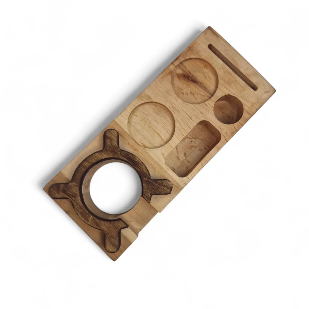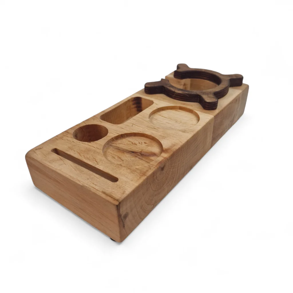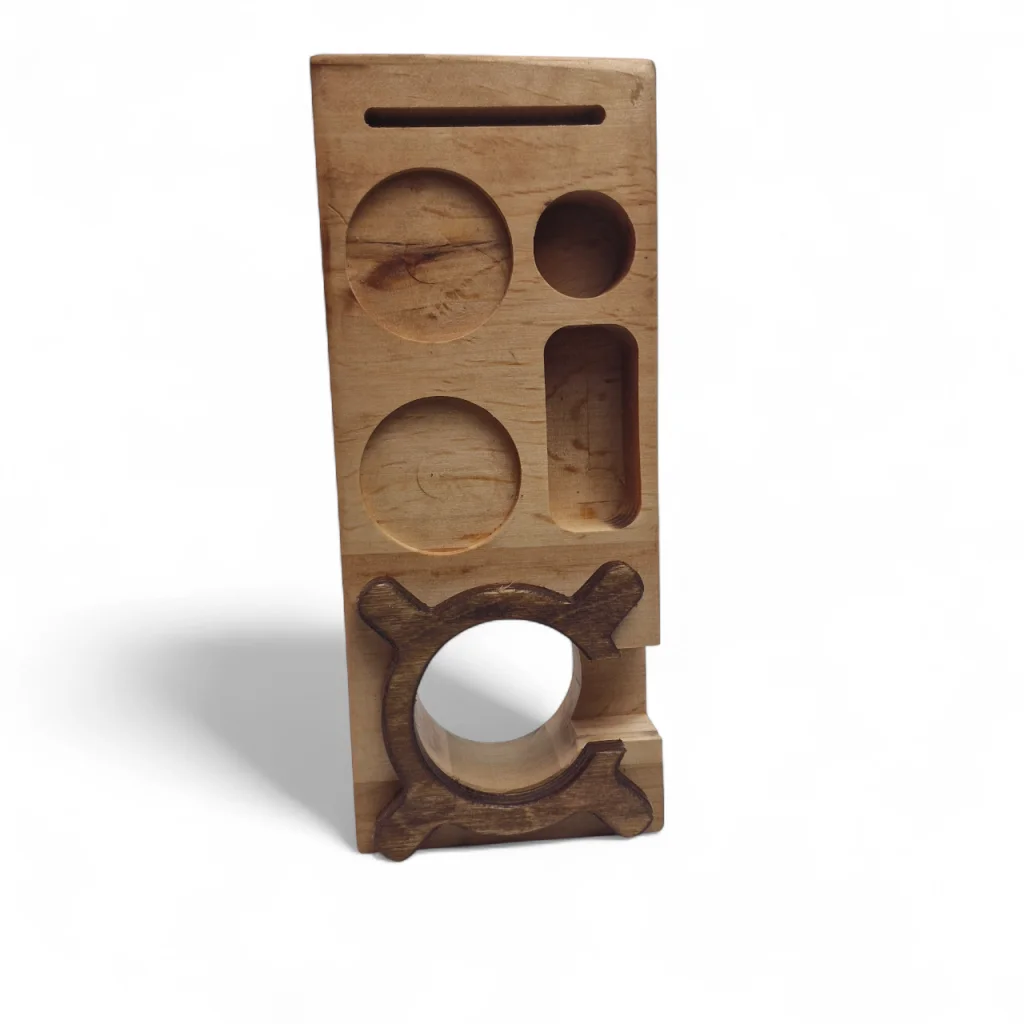 استند اسپرسو مینی با طراحی جمعوجور و جذاب از چوب طبیعی ساخته شده و با محفظههای دقیق و کاربردی خود، جایگاهی منظم برای فنجان اسپرسو، کپسول قهوه و لوازم کوچک فراهم میکند. ترکیب رنگ زیبای چوب و قطعات تیرهتر، جلوهای حرفهای و دکوراتیو به میز قهوه یا فضای آشپزخانه میدهد. حکاکی و تراش دقیق چوب باعث شده این استند علاوه بر کاربردی بودن، به یک المان زیبای دکوری نیز تبدیل شود. وزن مناسب و ابعاد کوچک آن استفاده و جابهجایی را آسان کرده و برای میزهای کوچک، دفتر کار یا حتی پک هدیه قهوه انتخابی عالی است. این استند میتواند نظم، زیبایی و حس کافهای را به فضای شخصی شما اضافه کند و تجربه سرو قهوه را دلپذیرتر سازد.