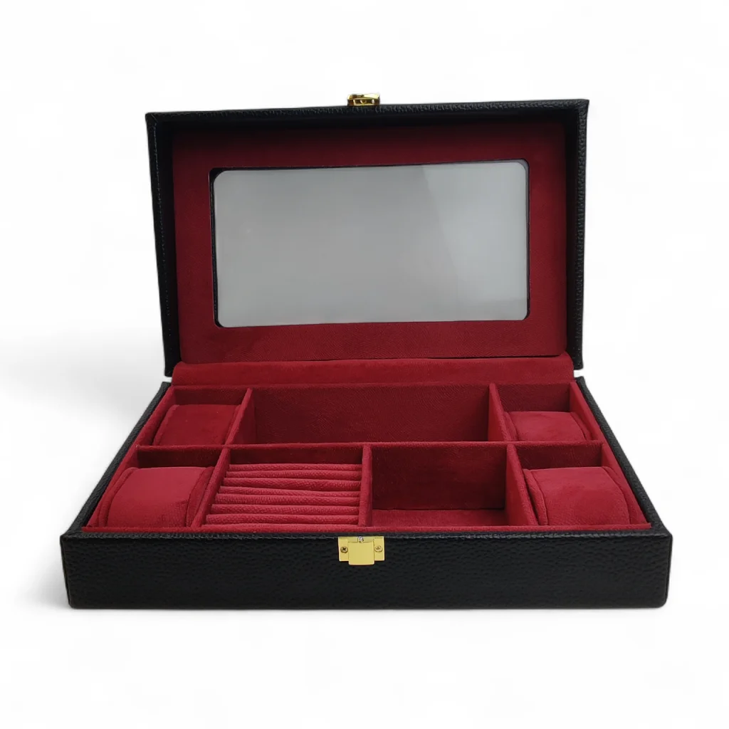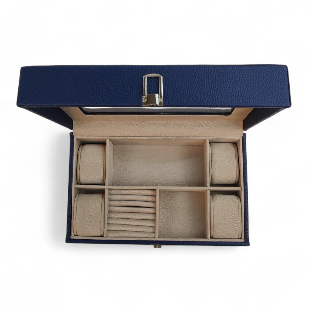 این جعبه لوکس چرمی برای نگهداری ساعت و جواهرات، ترکیبی از ظرافت و کارایی را بهخوبی به نمایش میگذارد. بدنهی بیرونی با روکش چرم مقاوم طراحی شده و داخل آن با آستر نرم جیر مزین شده است تا ساعتها، انگشترها و زیورآلات شما را با آرامش در خود جای دهد و از خراش خوردن محافظت کند. طراحی مدولار با پارتیشنبندی هوشمند، امکان نظمدهی منظم و مرتب را فراهم میکند و قفل طلایی کوچک باعث استحکام و احساس لوکسی بیشتر میشود. این جعبه برای استفاده روزانه یا هدیه دادن، گزینهای کاملاً مجلل و کاربردی است.