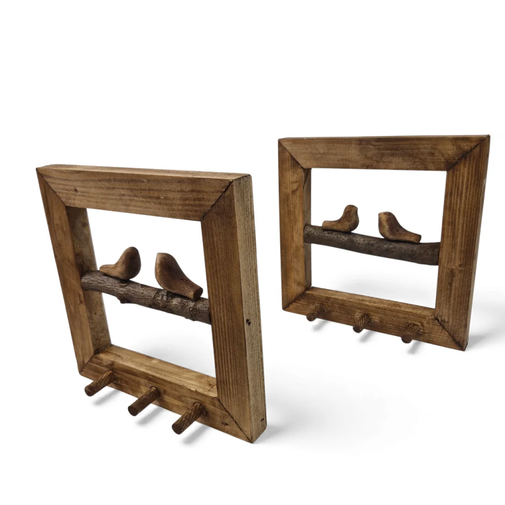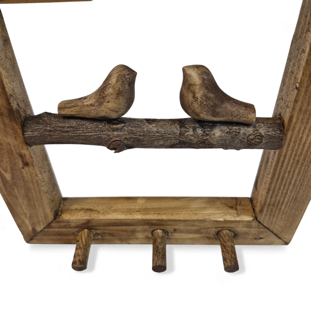جاکلیدی دیواری با دو پرنده چوبی در داخل آن، ترکیبی دلنشین از کاربرد و زیبایی است. طراحی الهامگرفته از طبیعت، در کنار چوب طبیعی، حس صمیمیت و گرما به فضای ورودی خانه میبخشد و به نظمدهی کلیدها کمک میکند.