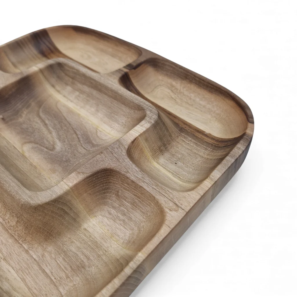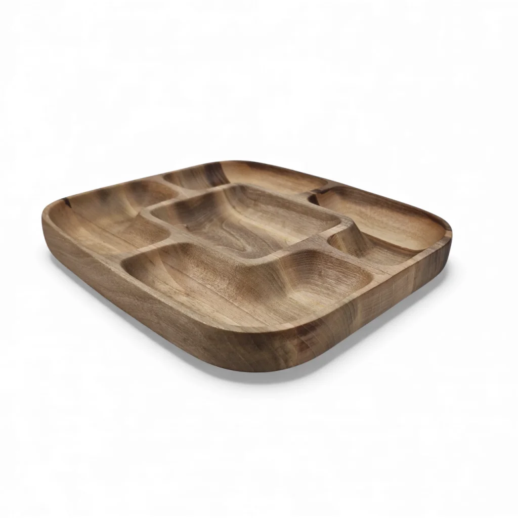 اردوخوری چوبی مربع پنج خانه با طراحی ساده و کاربردی، گزینهای مناسب برای سرو انواع تنقلات، مزه و خوراکیهاست. تقسیمبندی پنج خانه این محصول امکان چیدمان مرتب و دسترسی آسان به خوراکیها را فراهم میکند. استفاده از چوب باکیفیت، دوام بالا و حس طبیعی و گرم را به میز پذیرایی اضافه میکند. فرم مربع آن بهراحتی با سایر ظروف و دکورهای چوبی هماهنگ میشود.این محصول انتخابی مناسب برای مهمانیها، سرو روزمره و هدیهای کاربردی و شیک است.