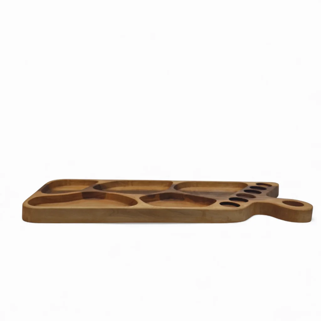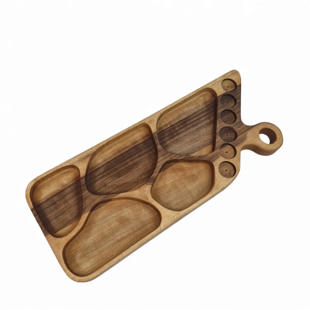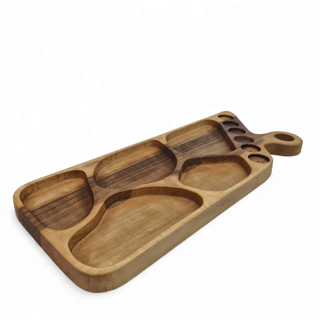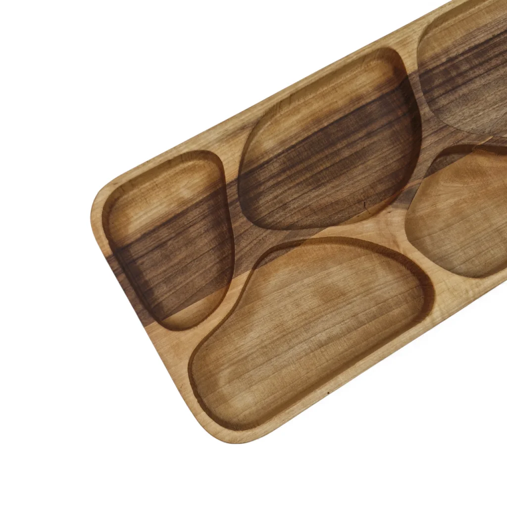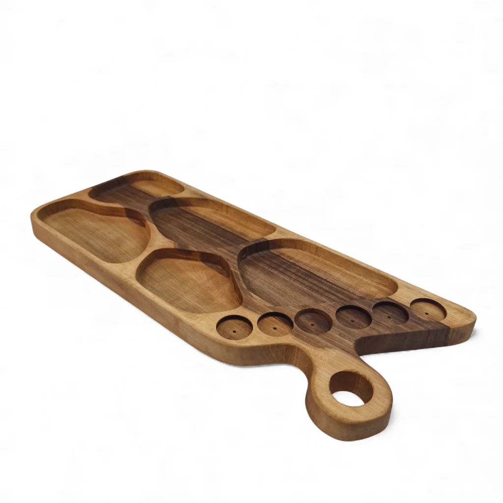 سینی مزه چوبی با جای شات بزرگ، یک قطعه زیبا و کاربردی است که طراحی آن به شکلی هنرمندانه با بافت طبیعی چوب انجام شده است. این سینی دارای بخشهای متعدد برای سرو خوراکیهای مختلف مانند پیشغذاهای سنتی خاورمیانه است و جای ویژهای برای شاتهای نوشیدنی در مرکز آن تعبیه شده است. این ویژگی باعث میشود که میهمانان به راحتی نوشیدنیهای خود را در کنار مزهها امتحان کنند. با طراحی جذاب و گرم، این سینی نه تنها به بهبود تجربه غذایی کمک میکند، بلکه به عنوان یک دکوری دلپذیر در هر محیطی جلوهای زیبا میبخشد.