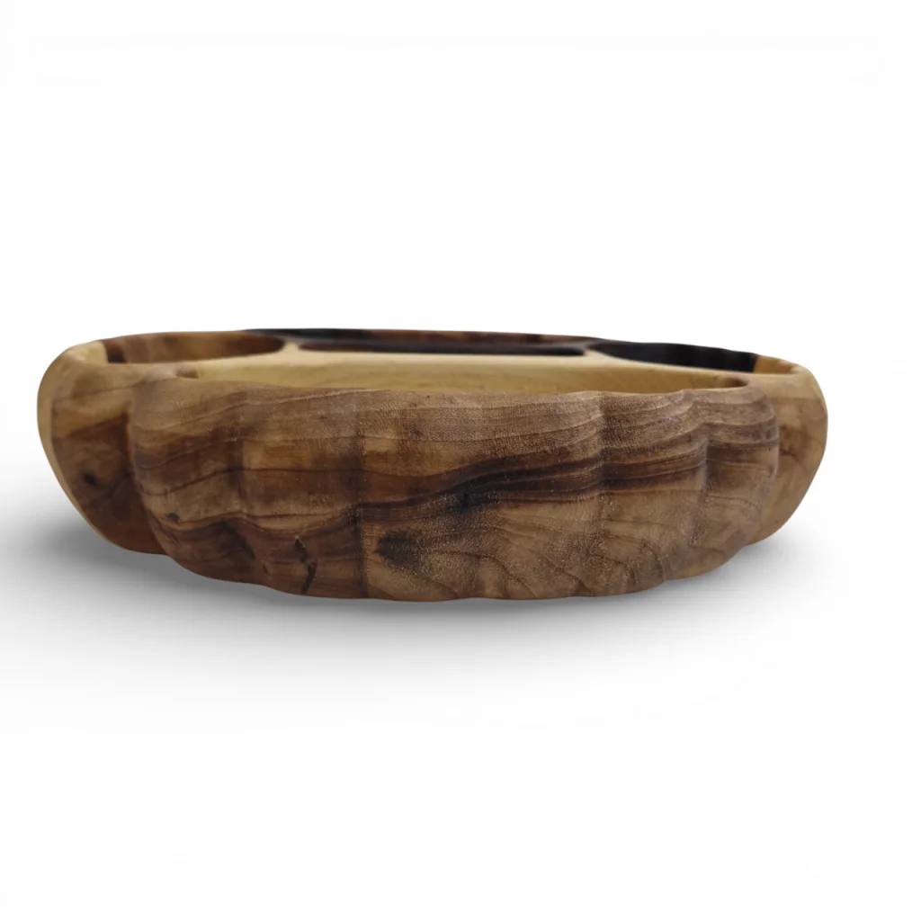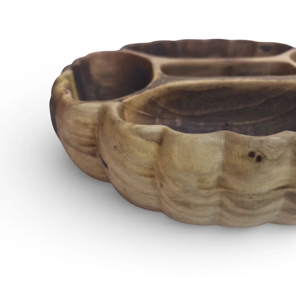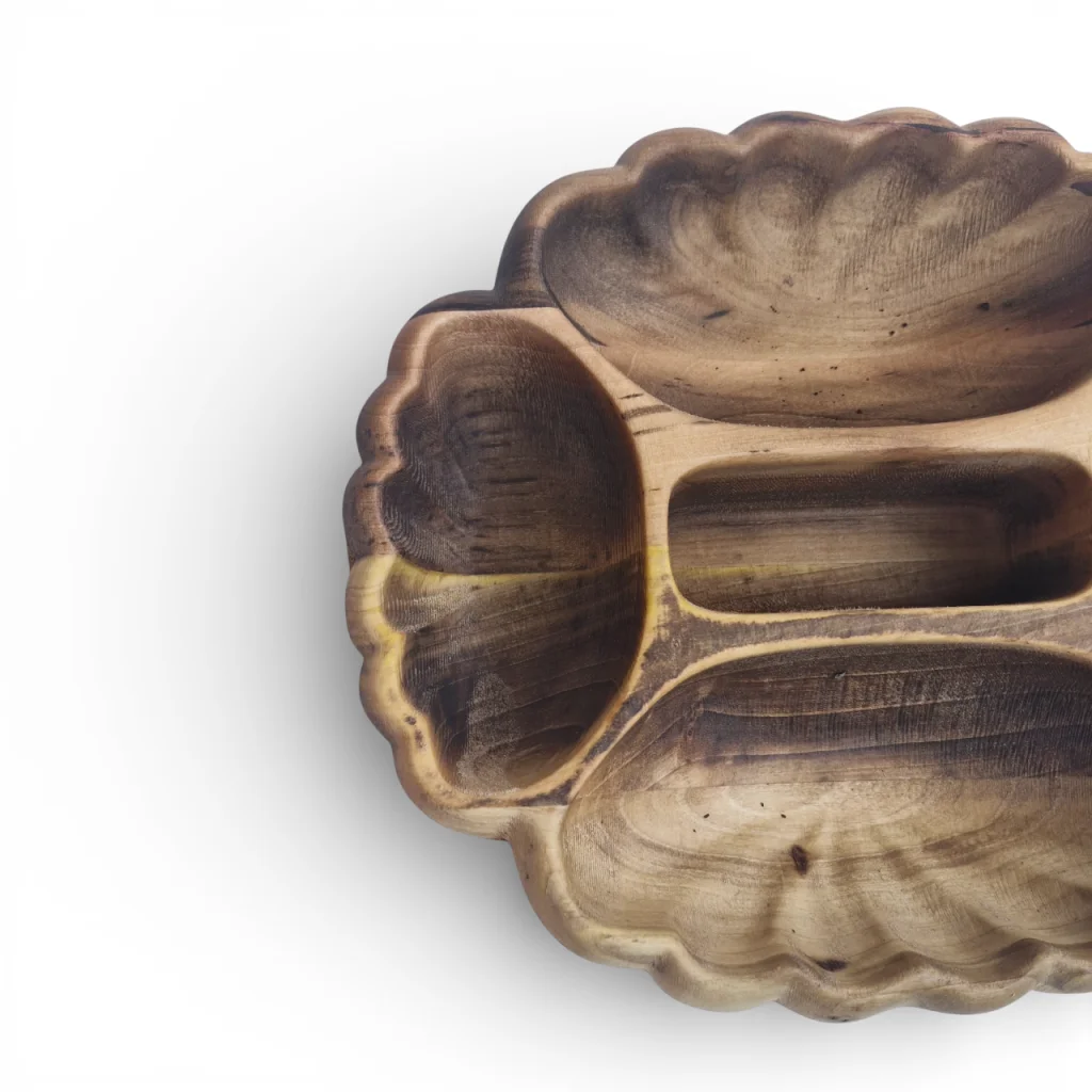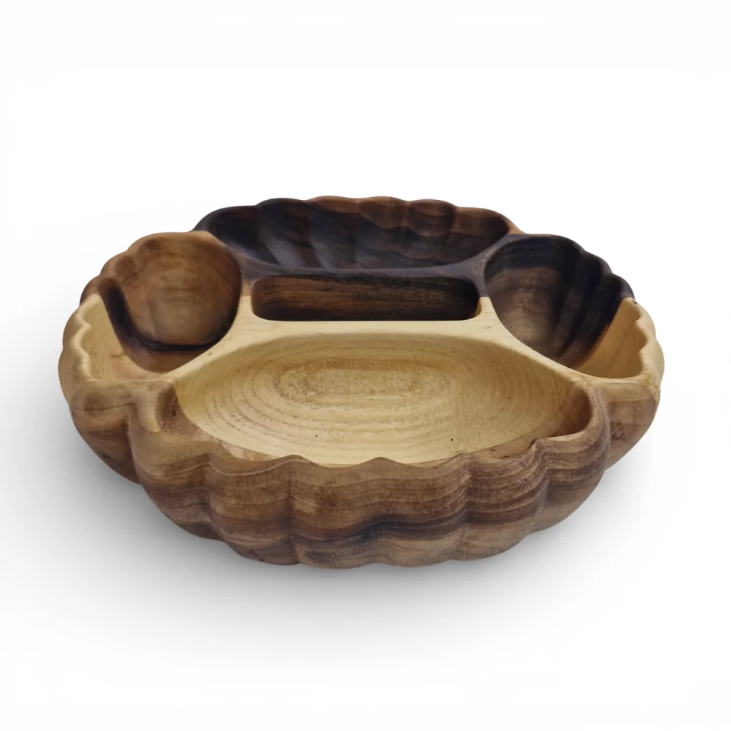 اردوخوری چوبی منبتکاریشده با ۵ خانه مجزا به طرح صدف یک قطعه سرو و پذیرایی بسیار ویژه و چشمنواز است که هم کاربردیست و هم دکوری. بدنهی اصلی آن از چوب طبیعی ساخته میشود که روی سطح بیرونی و در حاشیهها با هنر منبتکاری طرح صدف منیت شده است تا زیبایی چوب برجسته و چشمگیر شود. چنین ظرفی مناسب سرو آجیل، شکلات، تنقلات یا میوه خشک در مهمانیهاست و میتواند مرکز توجه میز پذیرایی باشد.