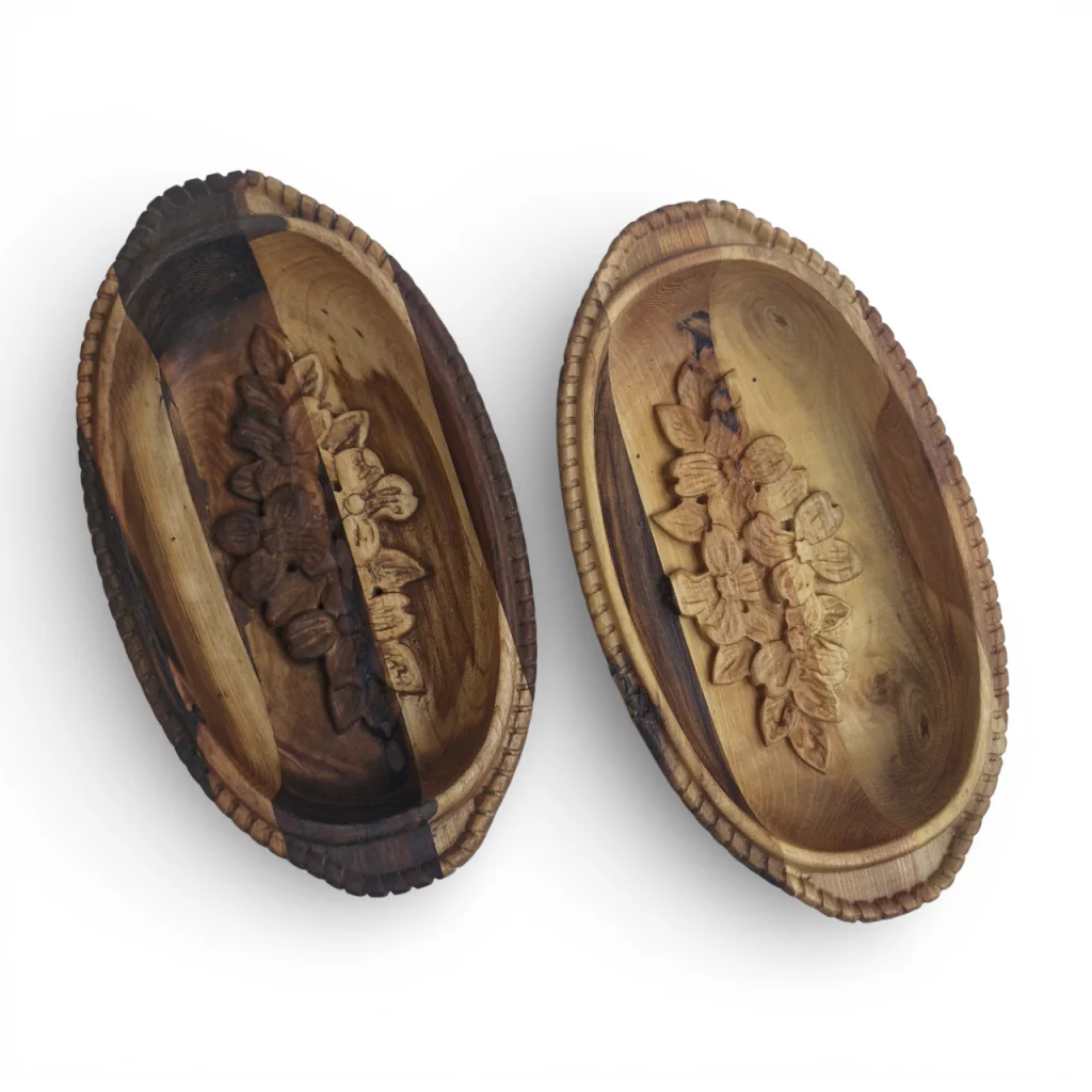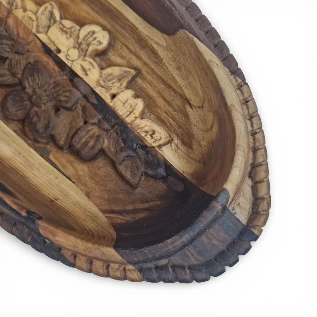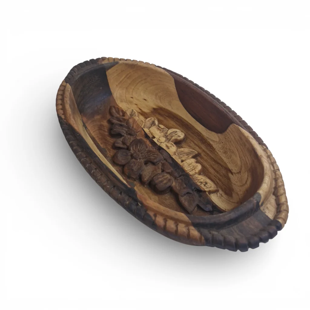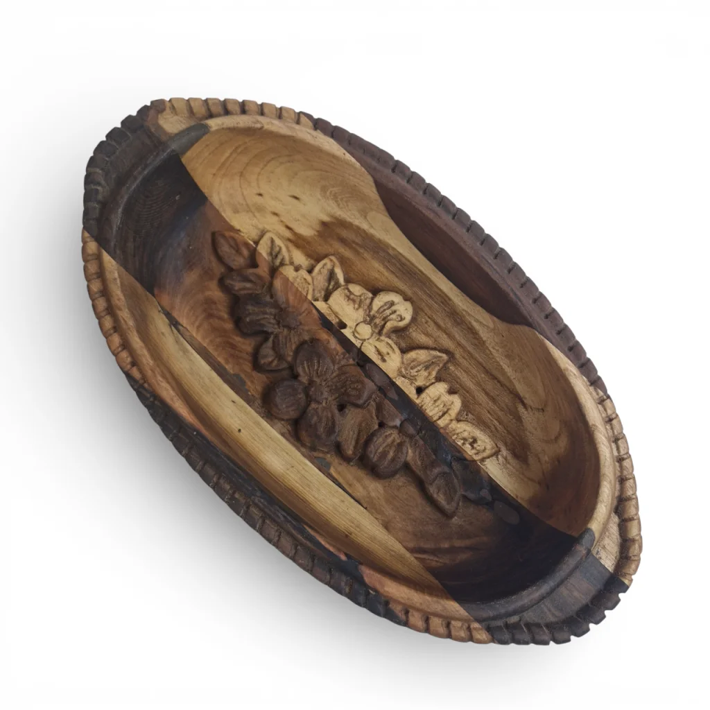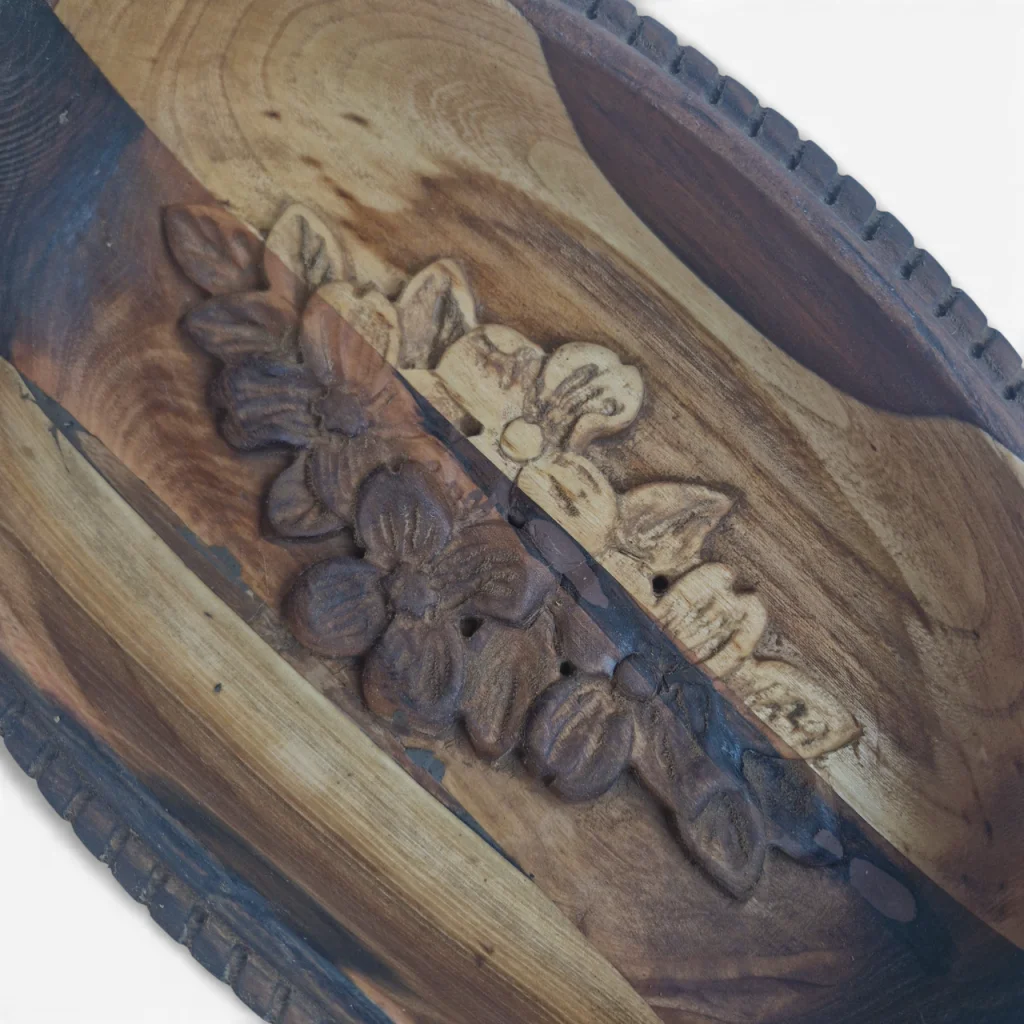 این ظرف (میوهخوری/اردوخوری) چوبی منبتکاری شده از جنس چوب طبیعی است که فرم بیضی نرم دارد و در مرکز آن نقش شکوفههای منبتشده دیده میشود. رنگ چوب با رگههای طبیعیِ متضاد، ترکیبی از قسمتهای روشن و تیره ایجاد کرده که جلوهای گرم و ارگانیک بهکار داده است. طراحی لبهها با برشهای ظریف و منبتکاری گلدار وسط، این ظرف را علاوه بر کاربردی بودن برای سرو میوه یا تنقلات، به یک قطعهی دکوری هنری و چشمنواز تبدیل کرده است که میتواند در میز پذیرایی یا قفسه دکور خانه جلب توجه کند.
