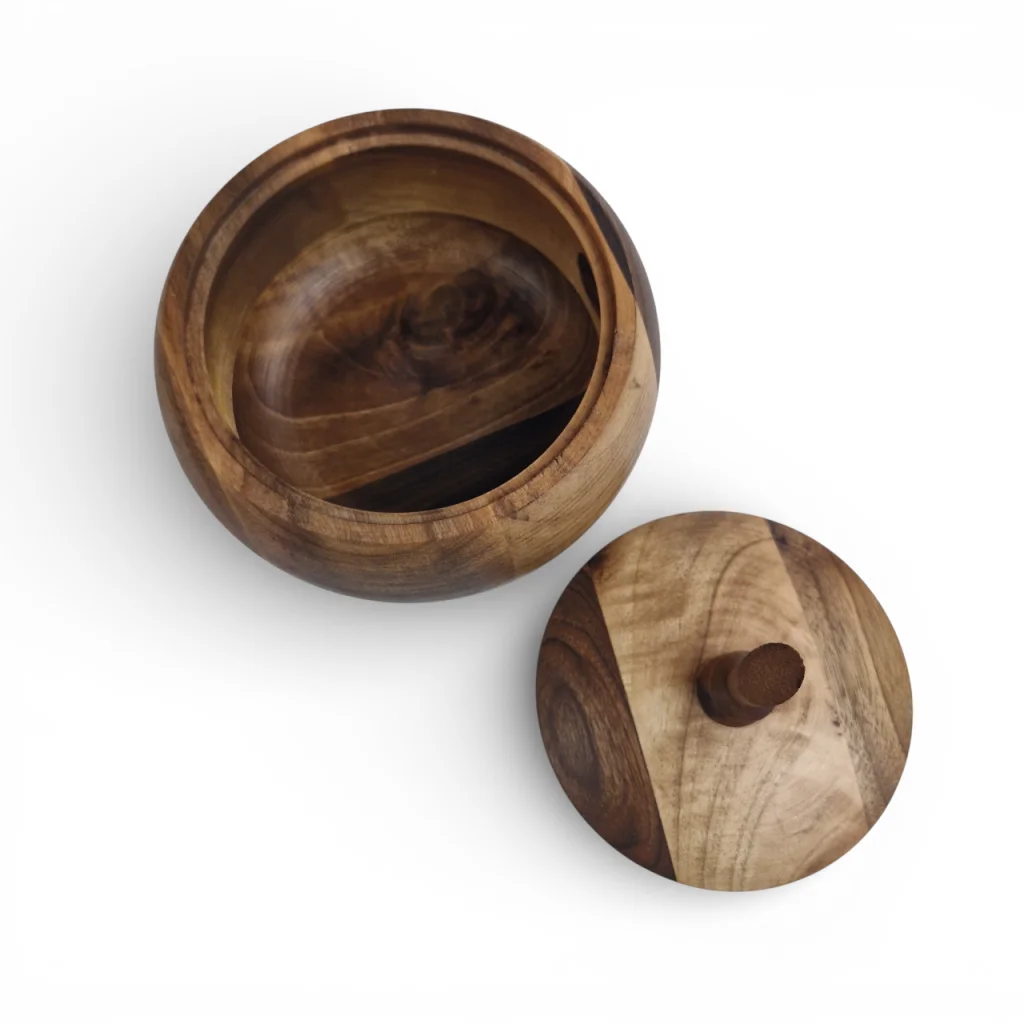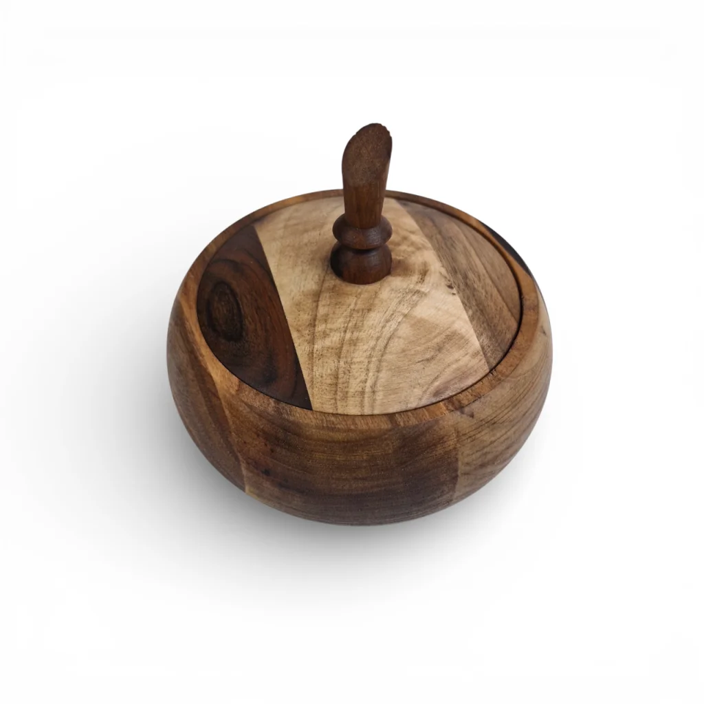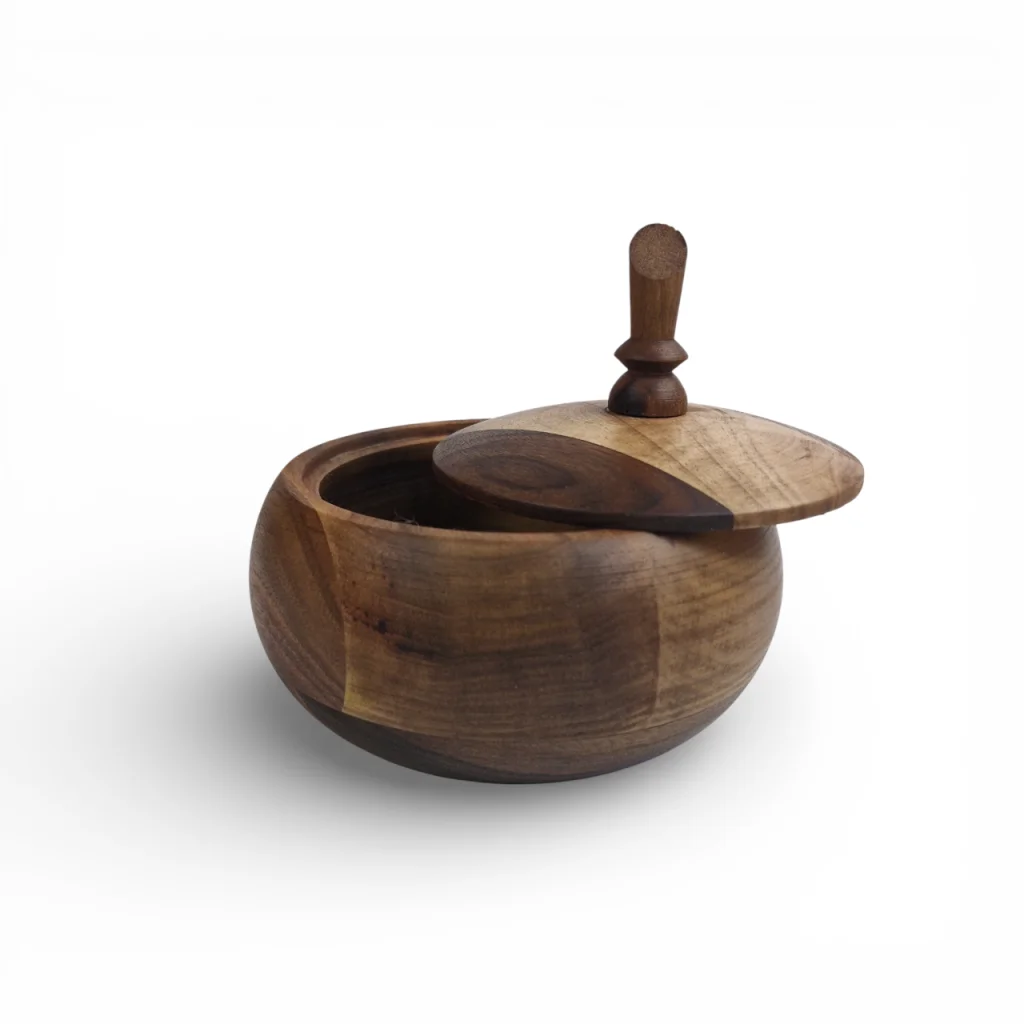 قندان چوبی دردار از جنس گردو، طراحیای نرم و مدور دارد که حس گرمای طبیعی چوب و ظرافت را به فضای پذیرایی شما میآورد. درب چوبی بهصورت جداشدنی است تا بتواند قند ، شکلات یا تنقلات را بهخوبی محافظت کند، و در عین حال ظاهر دکوراتیو چشمنوازی دارد. چنین ظرفی نهتنها برای سرو شکلات کاربردی است، بلکه به عنوان یک قطعه دکوری چوبی با ارزش در میز یا بوفه شما میدرخشد.
