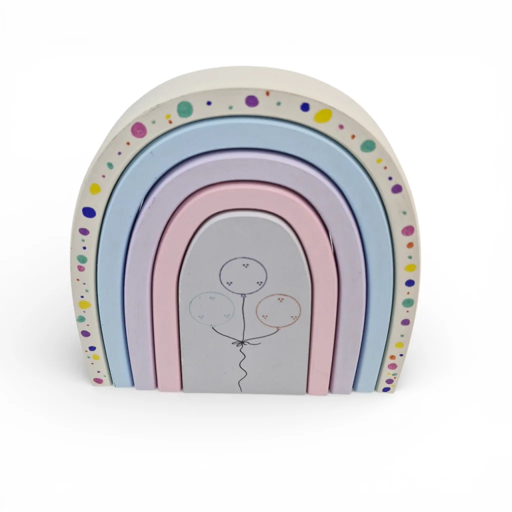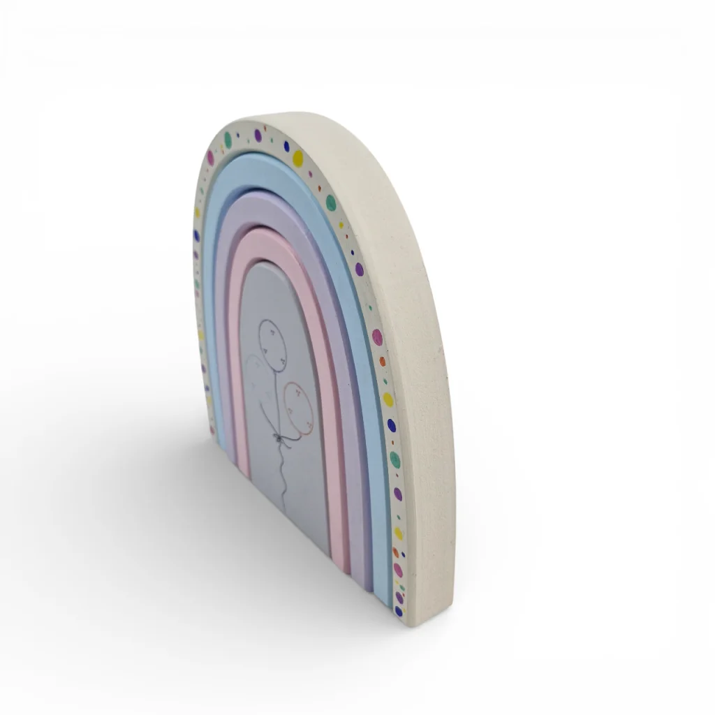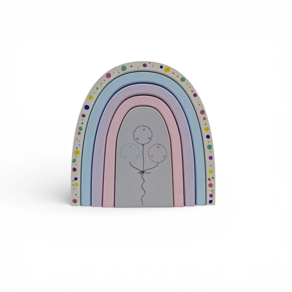 این اسباببازی زیبا به طرح نعل اسب از جنس چوب (ترجیحاً چوب روس یا چوب مناسب اسباببازیها) است که با کمانهایی رنگارنگ ساخته شده است. طرح بادکنک میان آن جلوهای شاد و رؤیایی به آن داده و توجه کودکان را به خود جلب میکند. سطوح چوبی صاف و پرداخت ظریف با رنگهای غیرسمی، لمس لطیف و ایمنی را فراهم میکند. این رنگین کمان نه فقط یک اسباببازی، بلکه اثری دکوری است که میتواند در اتاق کودک نقش معنوی و زیبایی داشته باشد.